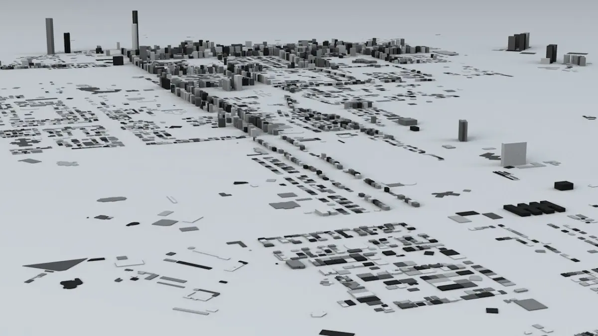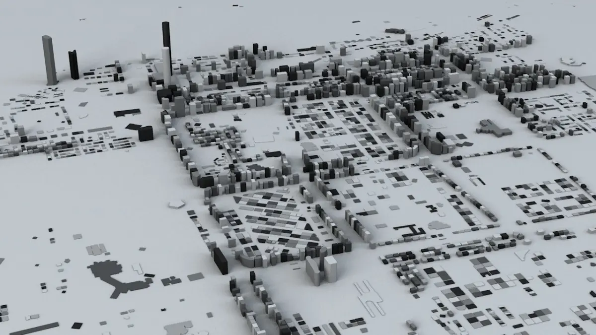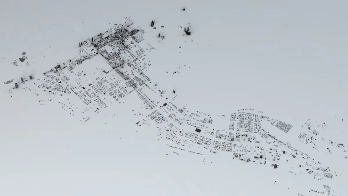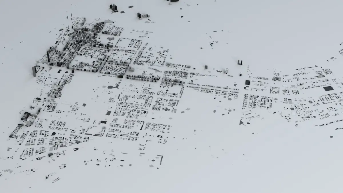 - the model is positioned on a flat surface (all buildings are on the “floor” - no elevation data included)