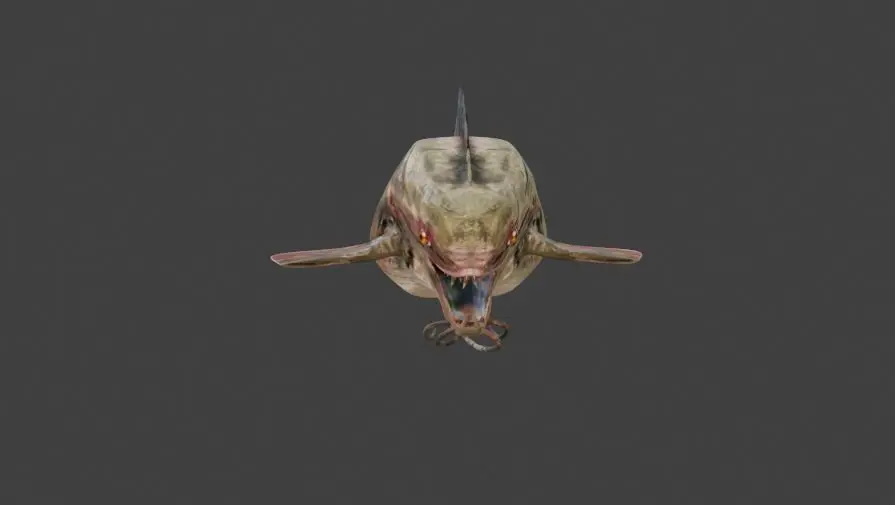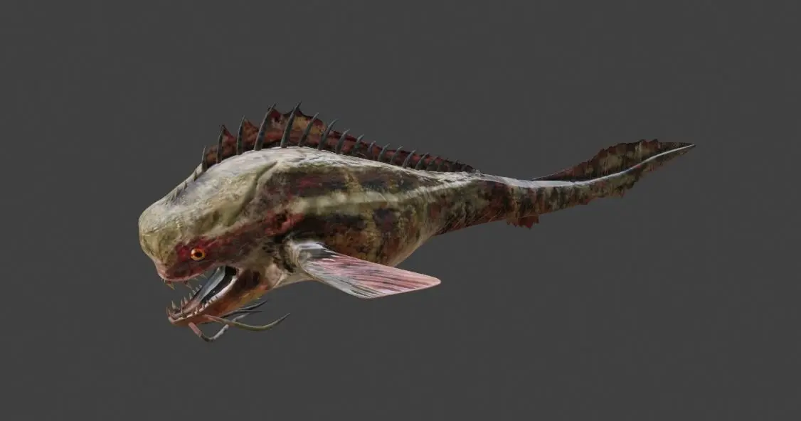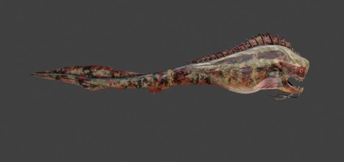 With razor-sharp teeth, haunting eyes, and twisted fins, this fish-like monstrosity is the stuff of nightmares. Witness as it glides through the abyssal depths, its movements calculated and ominous, ready to strike fear into the hearts of any who dare to cross its path.