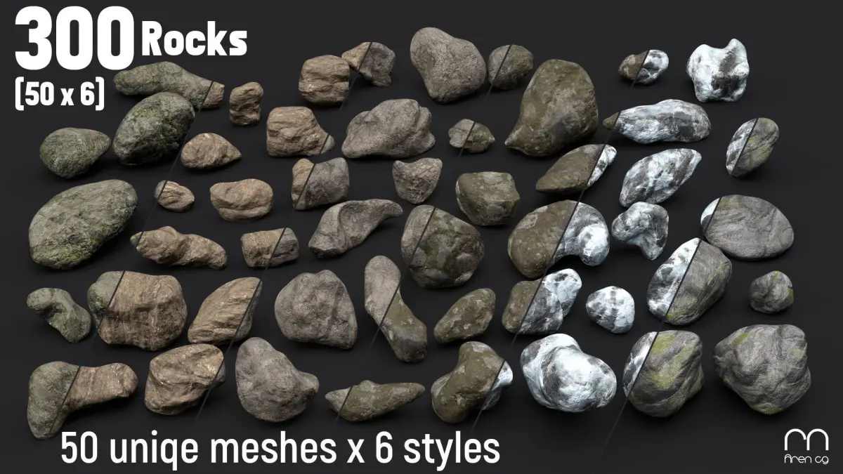 This collection contains 50 unique stones and each stone has 6 different materials. Also, every 5 stones have a texture set. Finally, this package contains 300 different stones with different materials