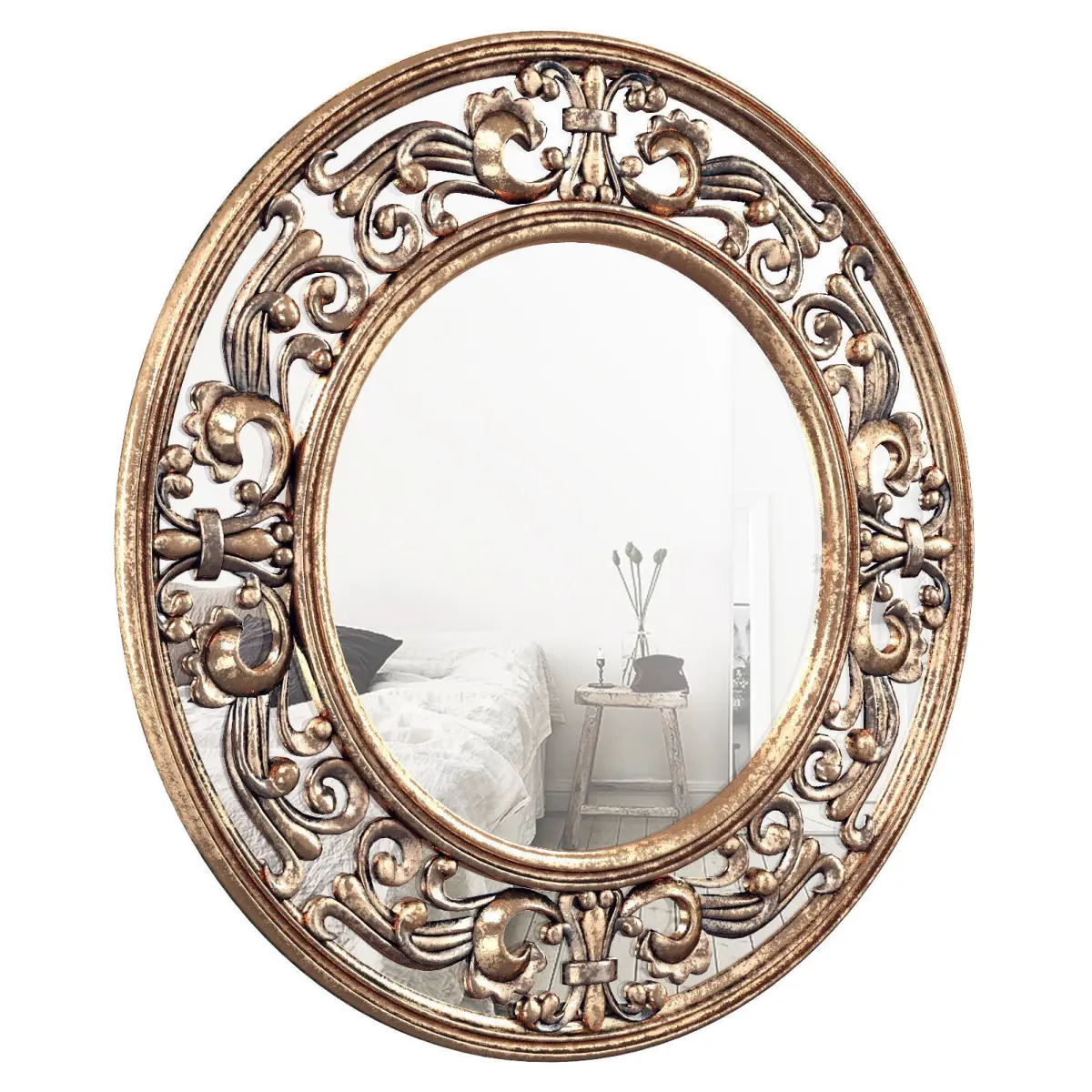 Mirrors are a great pick for traditional ensembles. Not only are they a classic accent, but they have a variety of other uses from opening up smaller spaces, brightening darker corners, or doubling wall art displays. To bring this function and some artful appeal to your home, hang this beautiful wall mirror. It showcases a regal-inspired design with an openwork scrolling frame that is finished with a chic golden hue and set on top of the mirror. Try hanging this mirror above a wood console table with turned feet in your entryway for a traditional display, then top the table with a blooming bouquet of red roses.Features