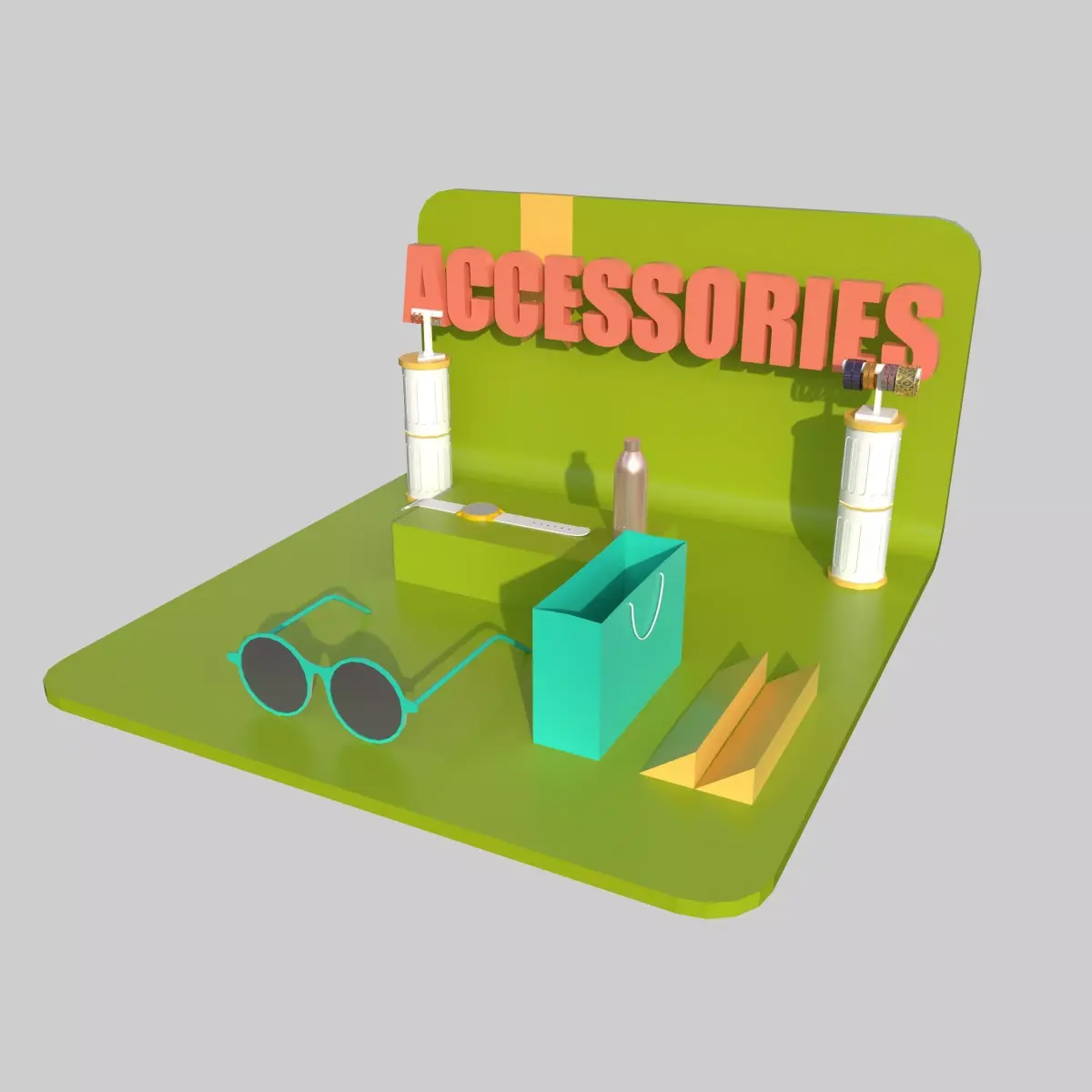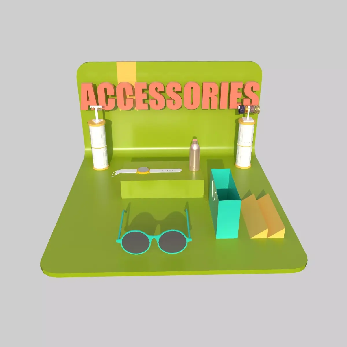A colorful, stylized Accessories Stall 3D model designed for shopping environments, carnival setups, theme parks, markets, and virtual retail simulations. The stall features a bright display board labeled “ACCESSORIES”, along with multiple accessory props such as sunglasses, watch, water bottle, cosmetic bottle, packaging boxes, and cylindrical display stands.