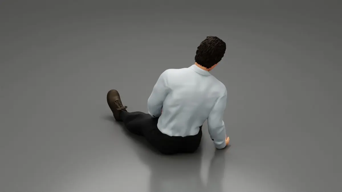 Accident of a male worker sitting on the floor with an injured 3D print model