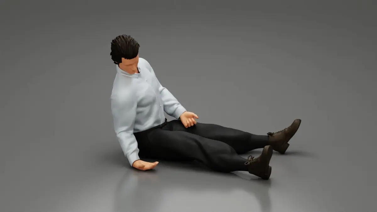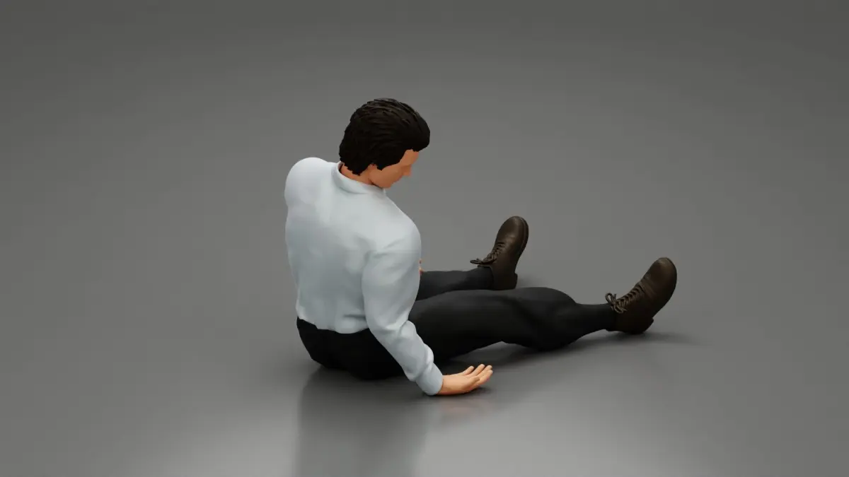 Home Catalog Accident of a male worker sitting on the floor with an injured 3D print model