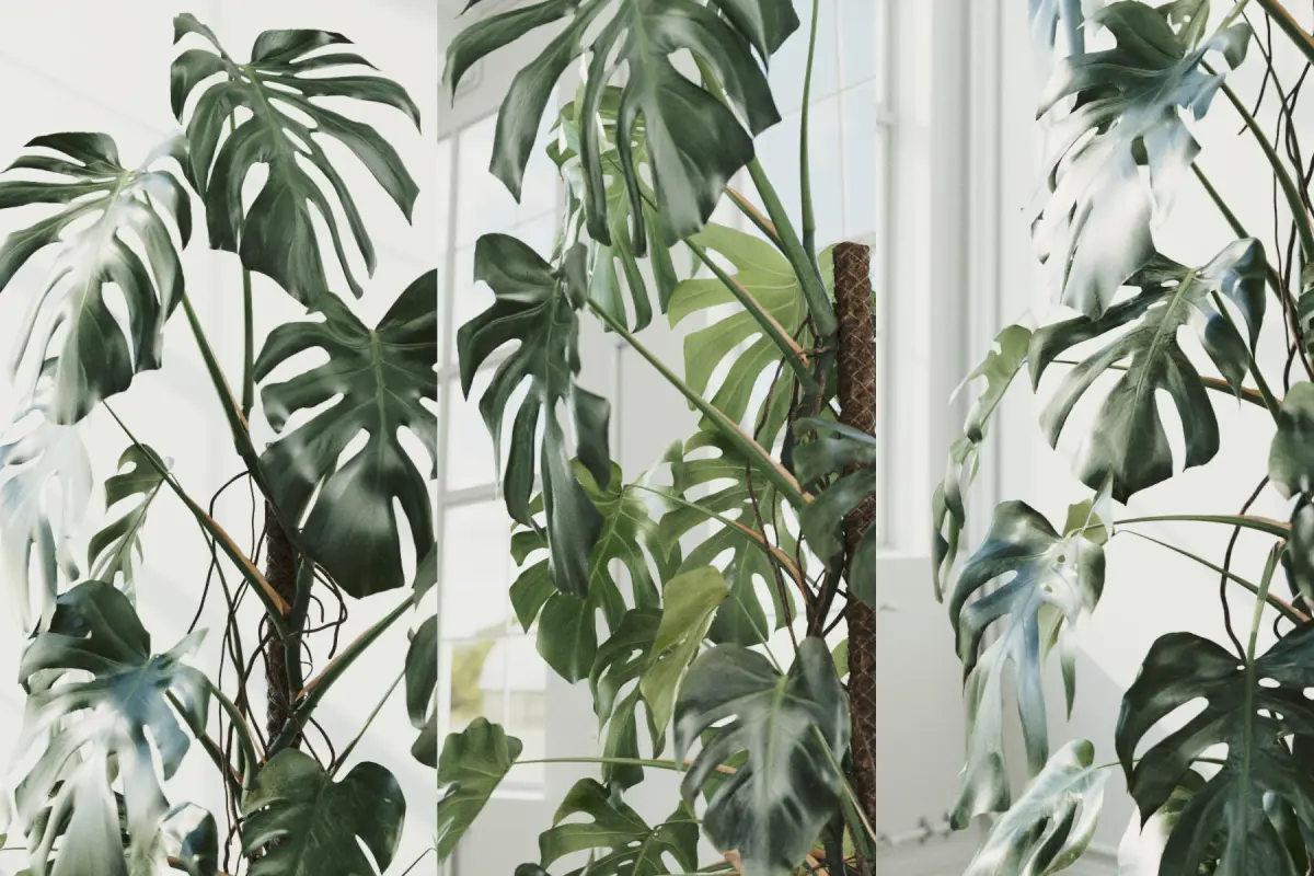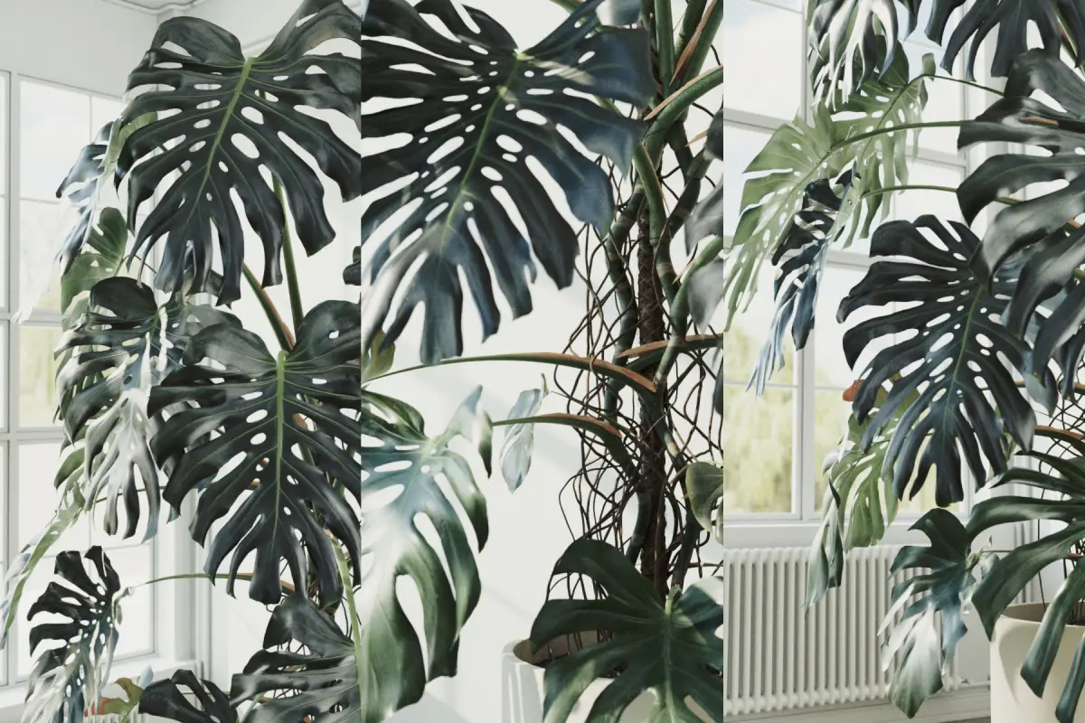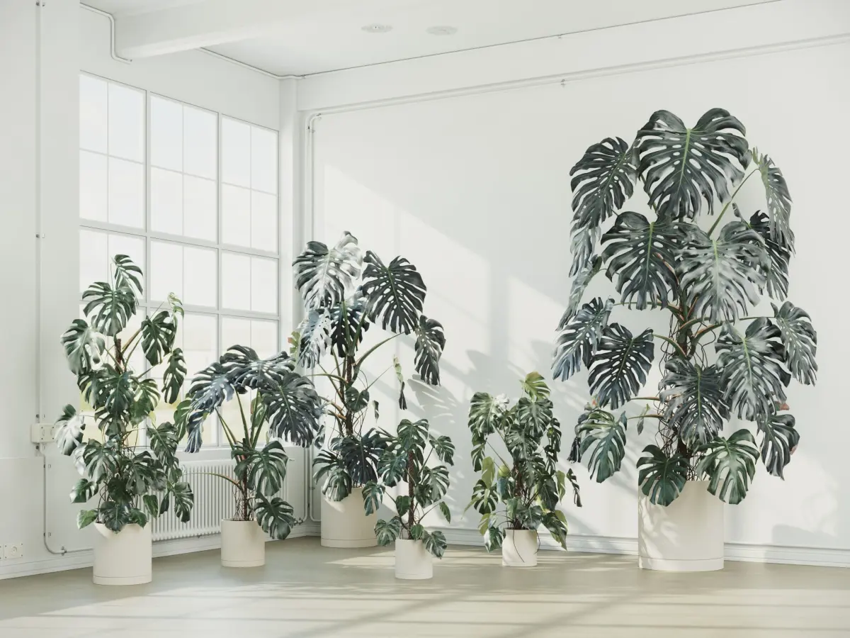 A collection of 6 highly detailed and accurate 3D models of a Monstera Deliciosa in a pot. The models is based on real-life references, with each leaf uniquely shaped to enhance realism.