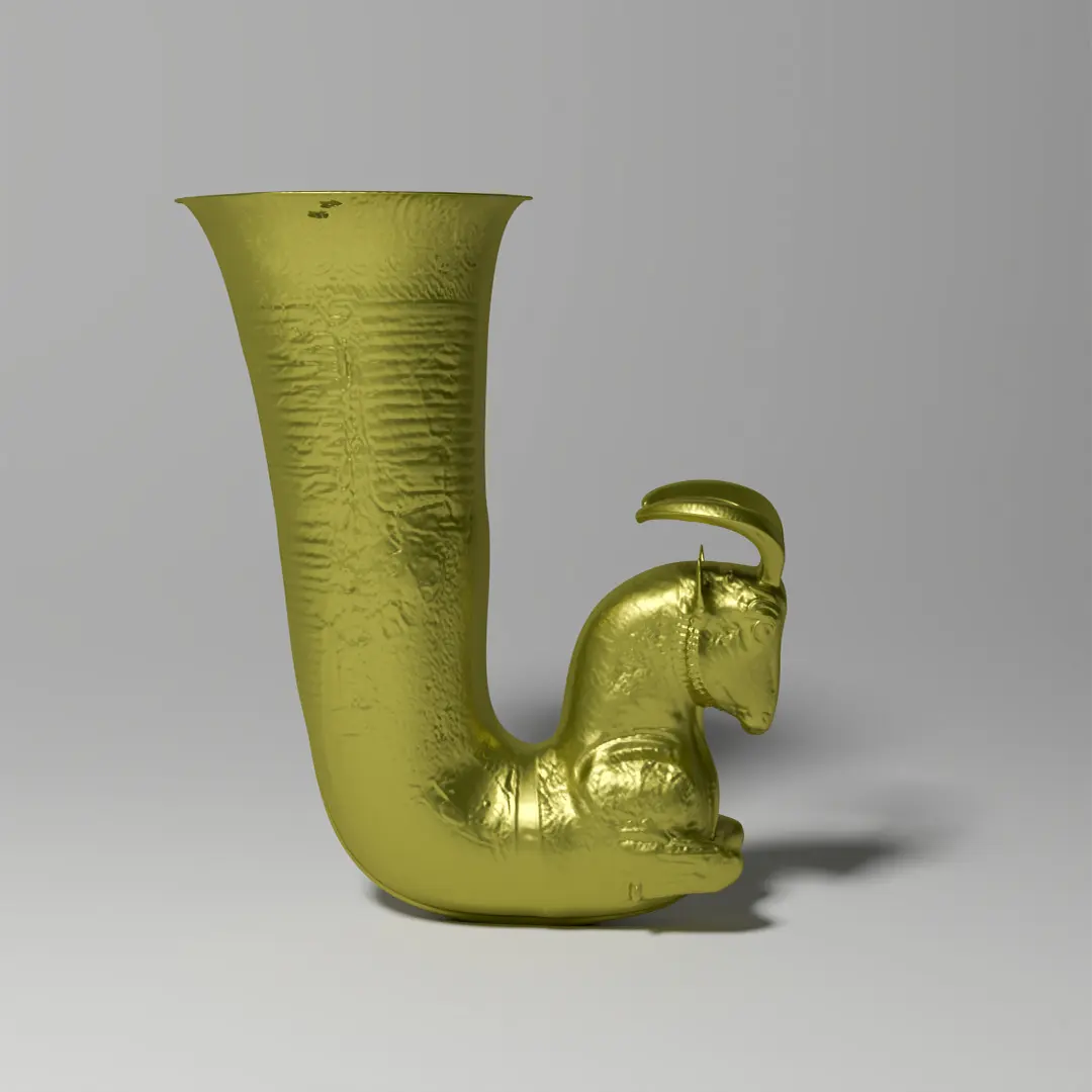 Rhyta originated in the Achaemenid Persian Empire, combining the older Near Eastern traditions of animal-headed beakers and Iranian traditions of animal-shaped vessels. They were used at royal banquets, where the Persian king displayed his wealth and power, and the ability to drink skillfully from a rhyton marked one as a member of the elite who were invited to such banquets. Rhyta were thus symbols of high status. Though many Achaemenid rhyta feature mythical or composite creatures, this one has ibex, a distinctly Iranian motif, because ibexes are native to the Zagros Mountains of western Iran, but did not live, for example, on the plains of Mesopotamia