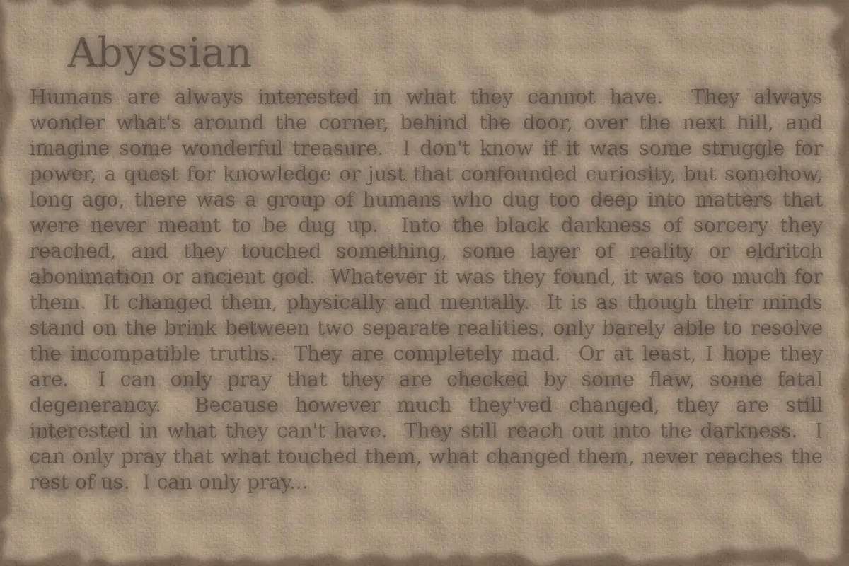 Humans are always interested in what they cannot have. They always wonder what's around the corner, behind the door, over the next hill, and imagine some wonderful treasure. I don't know if it was some struggle for power, a quest for knowledge or just that confounded curiosity, but somehow, long ago, there was a group of humans who dug too deep into matters that were never meant to be dug up. Into the black darkness of sorcery they reached, and they touched something, some layer of reality or eldritch abonimation or ancient god. Whatever it was they found, it was too much for them. It changed them, physically and mentally. It is as though their minds stand on the brink between two separate realities, only barely able to resolve the incompatible truths. They are completely mad. Or at least, I hope they are. I can only pray that they are checked by some flaw, some fatal degenerancy. Because however much they'ved changed, they are still interested in what they can't have. They still reach out into the darkness. I can only pray that what touched them, what changed them, never reaches the rest of us. I can only pray.