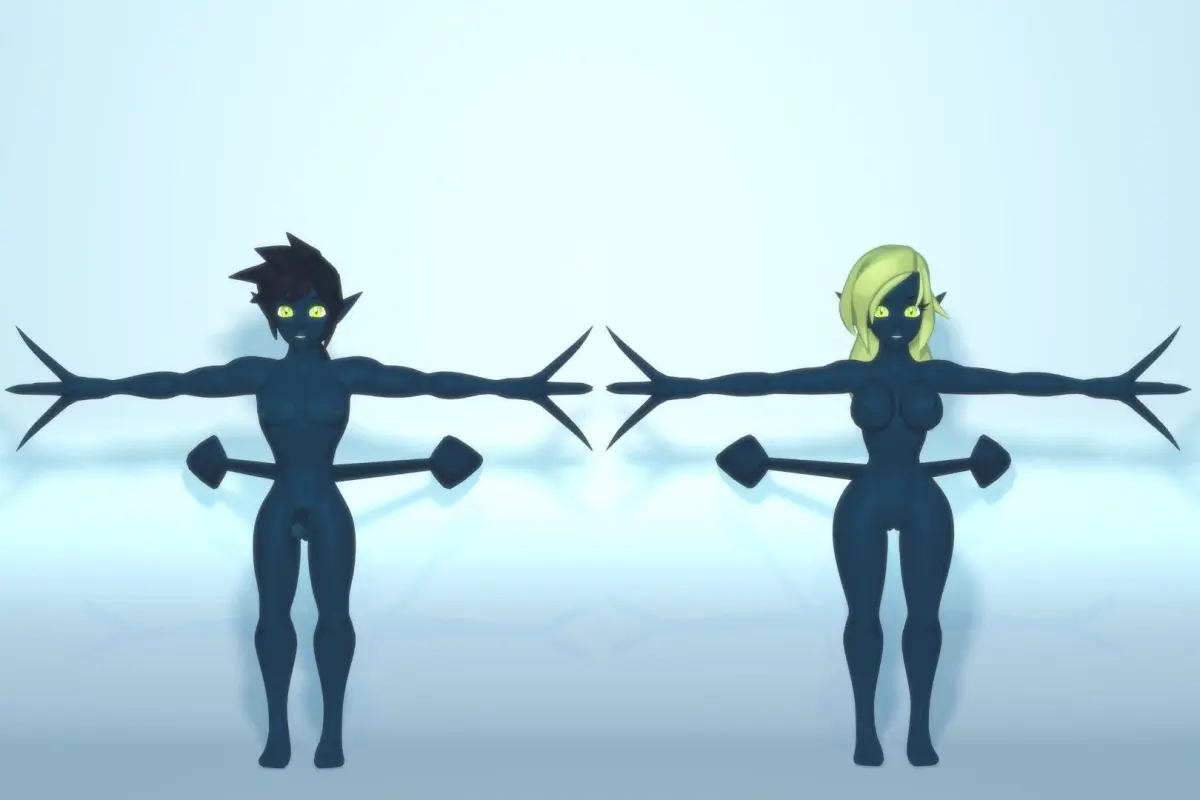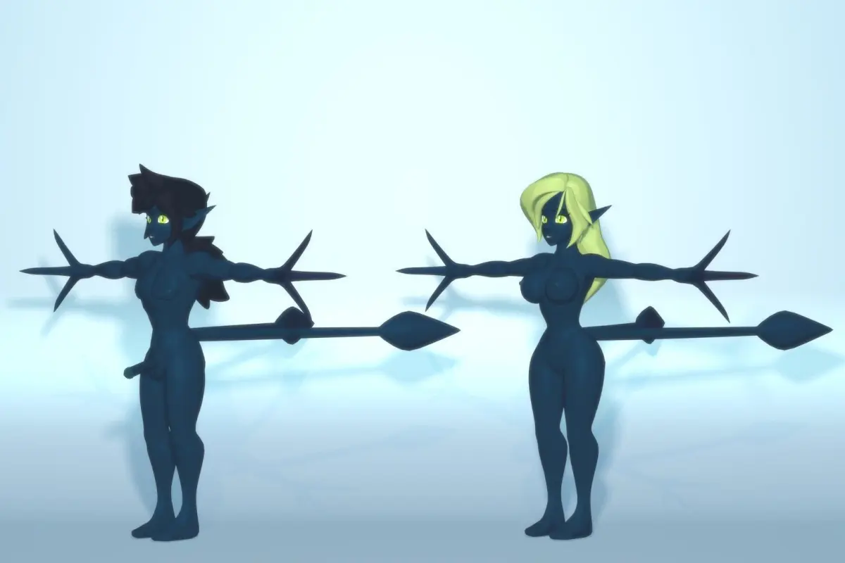 This is the totally nude, fully rigged, base mesh model for Acheron style Abyssian characters. Extra bones are provided to control the naughty bits, if needed. An exchangable texture with 16 color palettes is included. You can easily add your own, or mix and match to create a unique character for your unique project. Male and female can each use all colors.