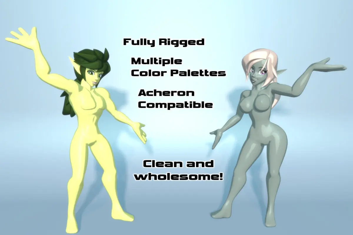 This is the completely clean, fully rigged, base mesh model for Acheron style Elf characters. An exchangable texture with 16 color palettes is included. You can easily add your own, or mix and match to create a unique character for your unique project. Male and female can each use all colors.