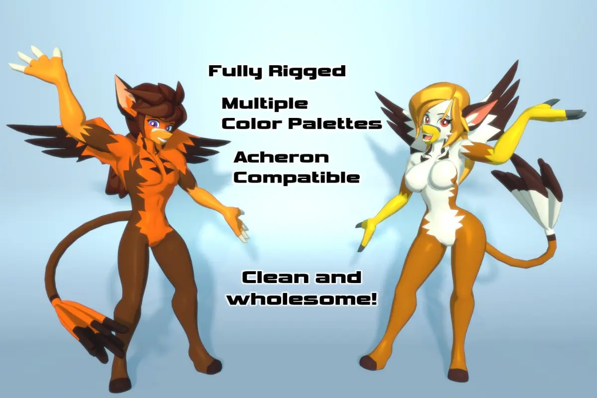 This is the completely clean, fully rigged, base mesh model for Acheron style Gryphon characters. An exchangable texture with 16 color palettes is included. You can easily add your own, or mix and match to create a unique character for your unique project. Male and female can each use all colors.