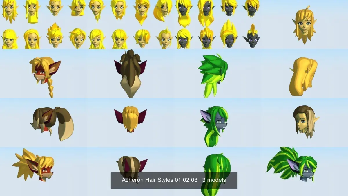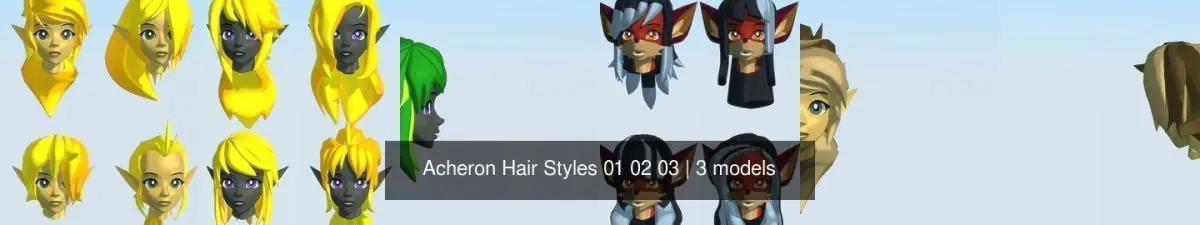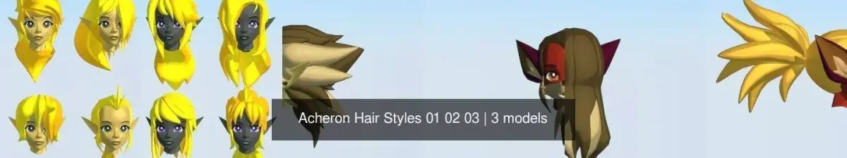 This pack contains 24 hair styles that can be used with any Acheron Series base meshes. The Acheron Rig is not included, but all these hair styles have the proper vertex groups to use the Rig. If you have bought the Acheron Rig separately, just add these models to the rig's file, zero out the transforms, add an armature modifier, and you should be good to go.