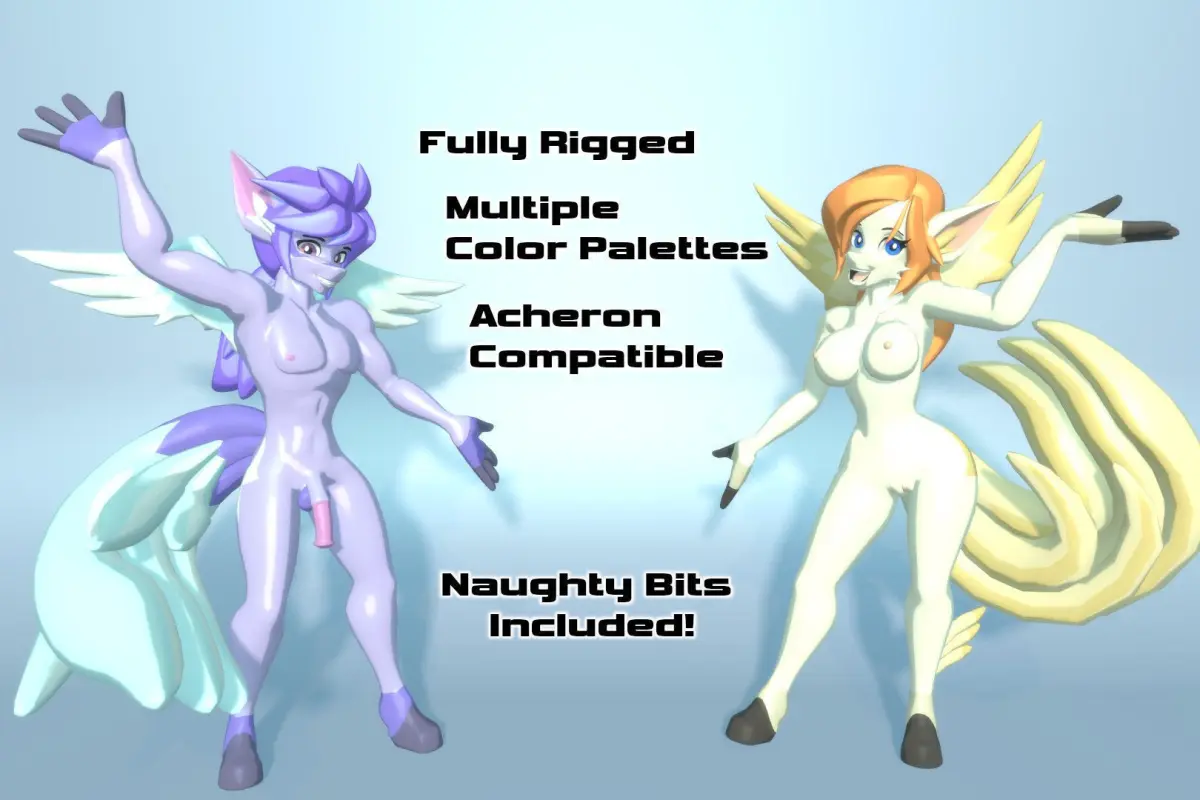 This is the totally nude, fully rigged, base mesh model for Acheron style Pegasus characters. Extra bones are provided to control the naughty bits, if needed. An exchangable texture with 16 color palettes is included. You can easily add your own, or mix and match to create a unique character for your unique project. Male and female can each use all colors.