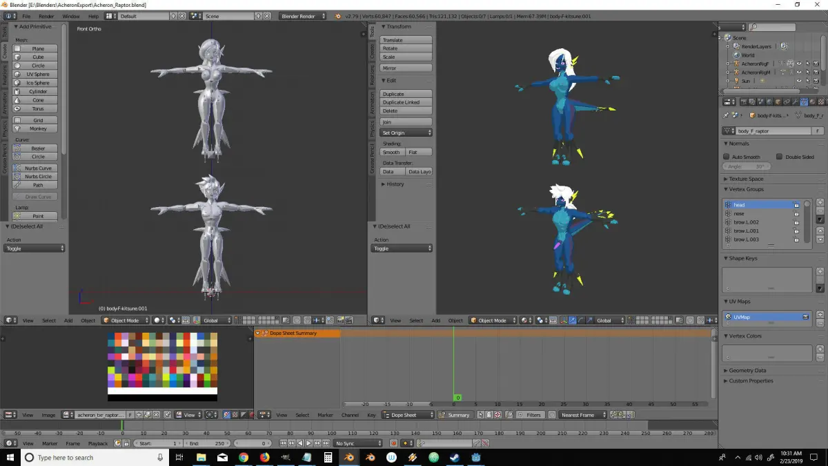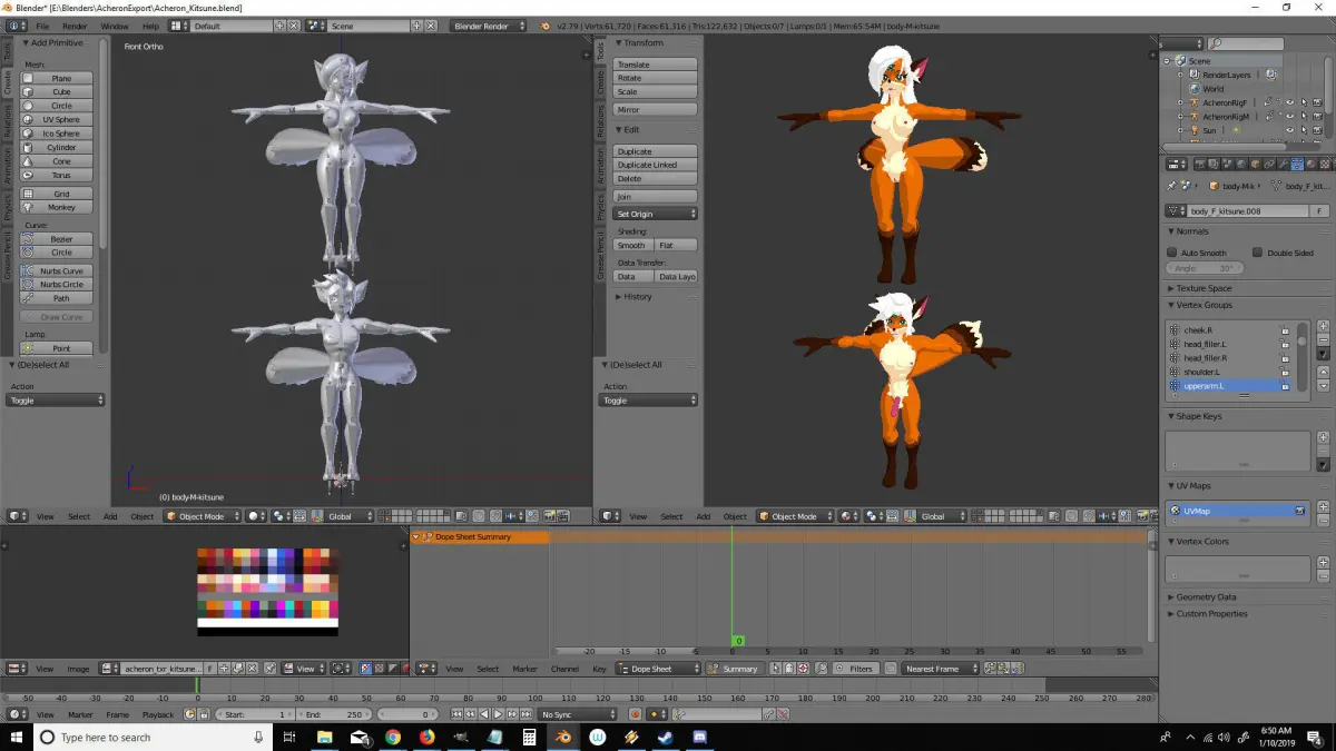 These characters are totally nude, fully rigged, Acheron style base mesh models. Extra bones are provided to control the naughty bits, if needed. An exchangable texture with 16 color palettes is included for each race. You can easily add your own, or mix and match to create a unique character for your unique project. Male and female can each use all colors. Check out the original product pages for more preview images.