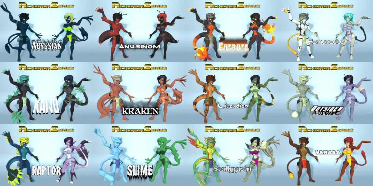 These characters are totally nude, fully rigged, Acheron style base mesh models. Extra bones are provided to control the naughty bits, if needed. An exchangable texture with 16 color palettes is included for each race. You can easily add your own, or mix and match to create a unique character for your unique project. Male and female can each use all colors. Check out the original product pages for more preview images and .