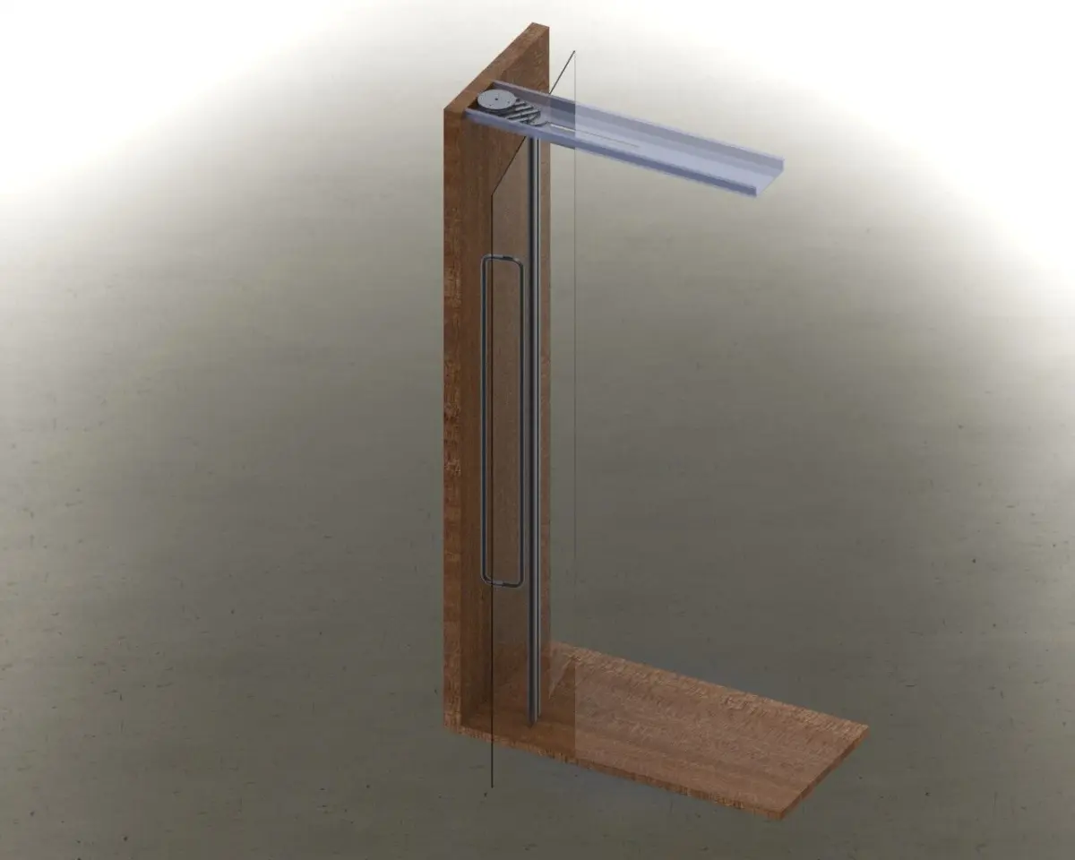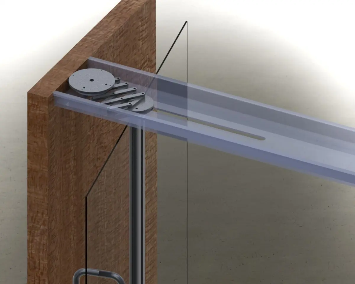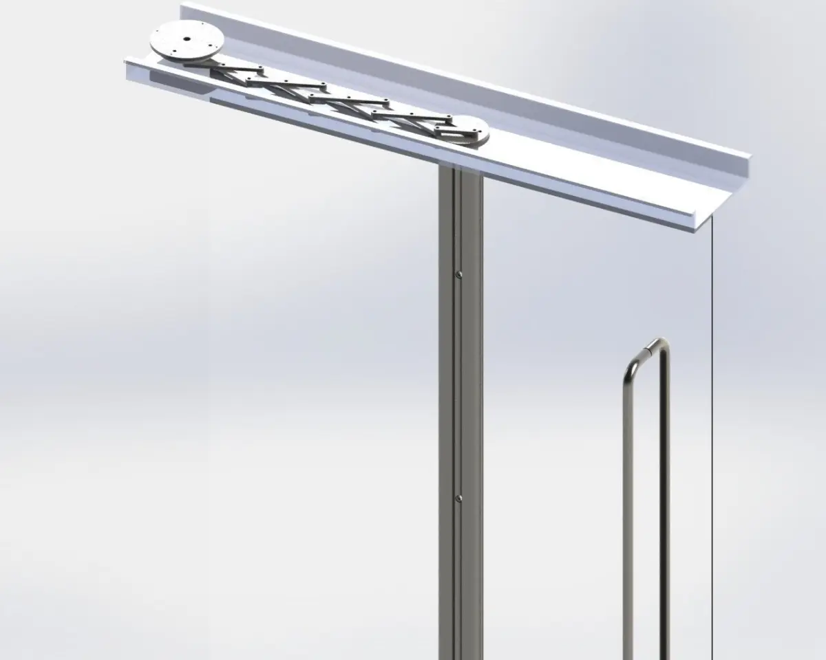Hinge made entirely of stainless steel, maintenance free.Based on a four bar mechanism.The concept is to eliminate the wind resistance by folding the glass door against the wall.It is proposed as an option to build a the prototype and evaluate the user acceptance.During the simulations, with a force of 30 N, you can open in just 2 seconds.