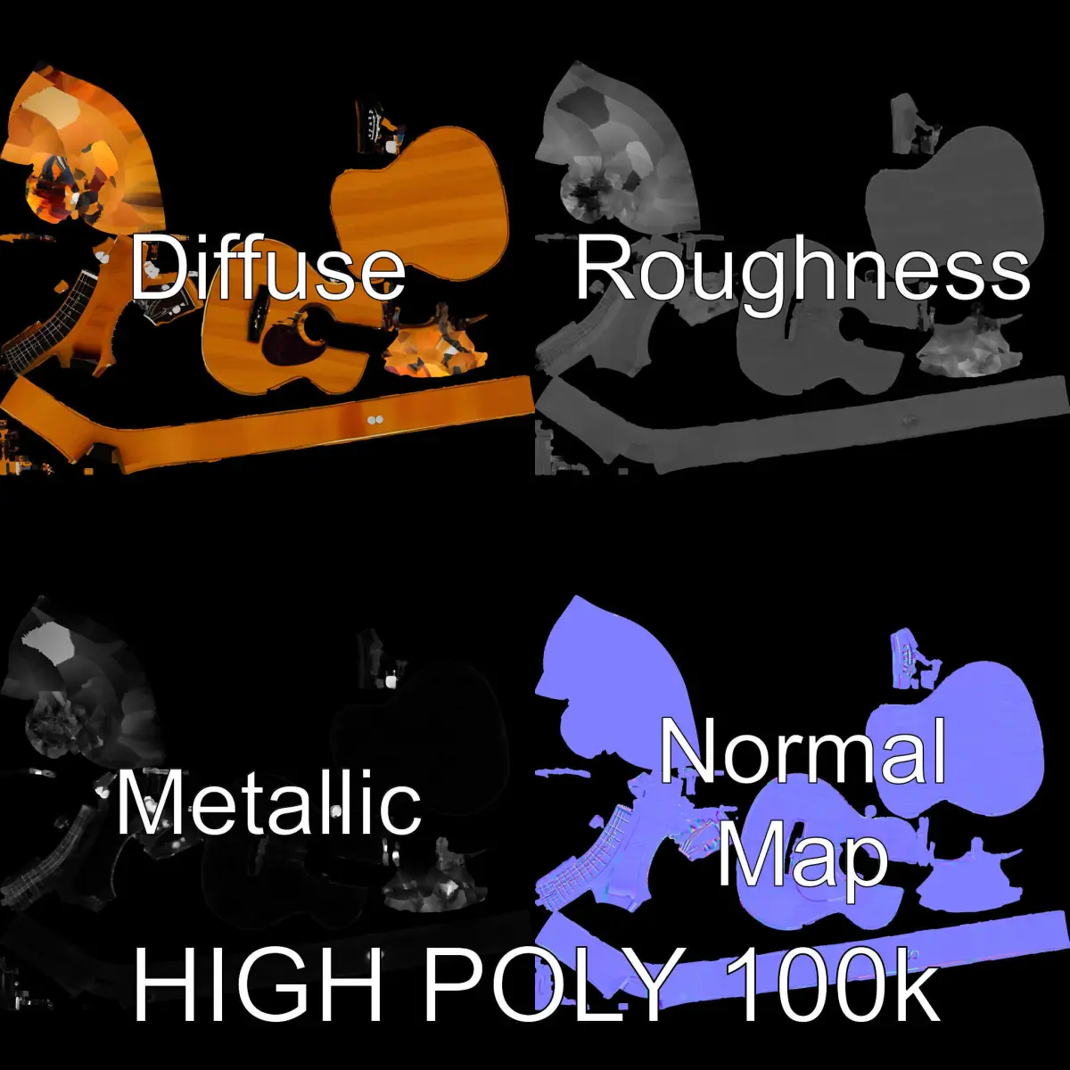 This 3D model pack includes a detailed acoustic guitar, crafted with precision for high-quality rendering. Whether you are developing a mobile game, a detailed animation, or a production-level rendering, this guitar model suits your needs. Each model comes with three levels of detail: from 1,000 triangles for mobile optimization to 100,000 triangles for high-quality production visuals. The models feature PBR materials, including Diffuse, NormalMap, and reflection/roughness/metallic, all with 4096x4096 resolution textures, ensuring a realistic appearance in any modern rendering engine.