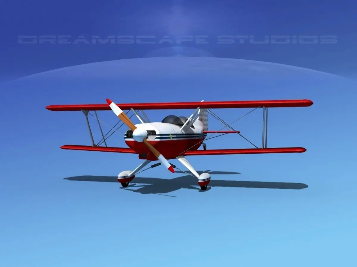 Acro Sport Biplane is built near to scale, highly detailed and includes many great features. First the model includes textures for the fabric covering, sewing and for leading edge smooth areas where plywood leading edges are used. The cockpits include complete instrumentation, materials for the gauges, switches, controls and knobs. Rudder peddles are also included. Structural flying wiring is modeled on the wings, tail and stabilizer. The ailerons on (bottom and top wings) elevators, rudder, and the propeller are animatable. Pull the cowling off to reveal a nearly complete engine compartment with a 4 cylinder opposed inline, air intakes, starter, flywheel and mounts. Cooling plates are also modeled.