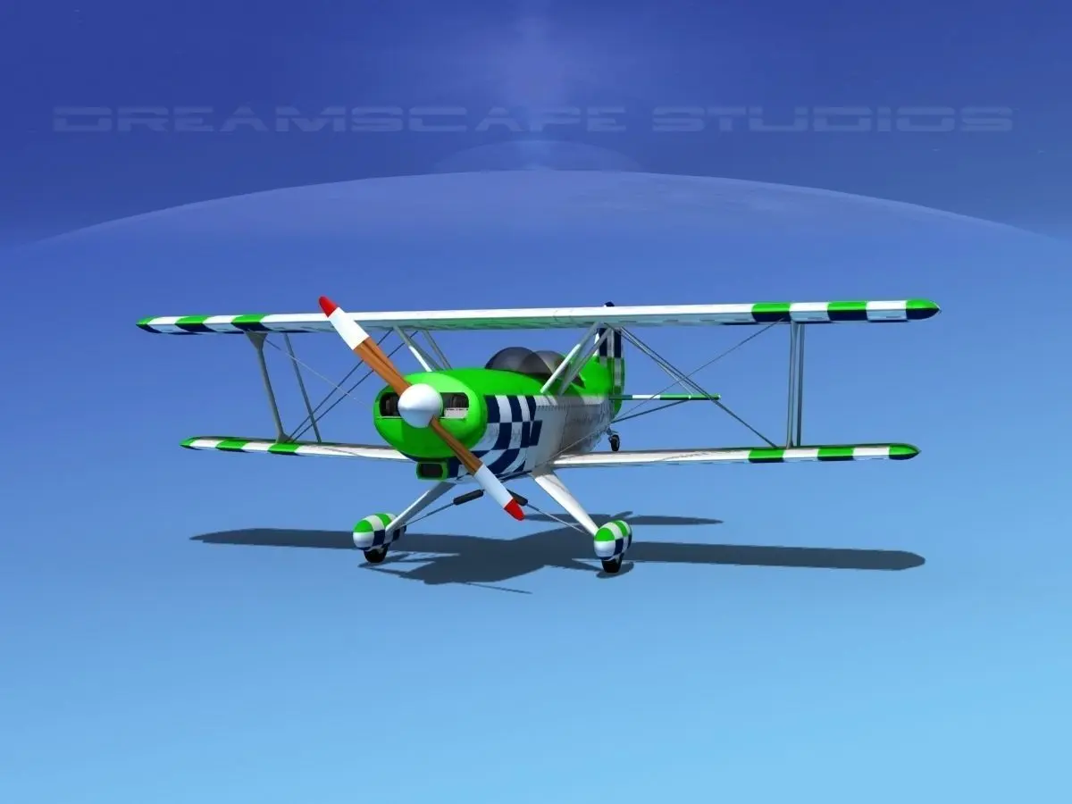 Acro Sport Biplane is built near to scale, highly detailed and includes many great features. First the model includes textures for the fabric covering, sewing and for leading edge smooth areas where plywood leading edges are used. The cockpits include complete instrumentation, materials for the gauges, switches, controls and knobs. Rudder peddles are also included. Structural flying wiring is modeled on the wings, tail and stabilizer. The ailerons on (bottom and top wings) elevators, rudder, and the propeller are animatable. Pull the cowling off to reveal a nearly complete engine compartment with a 4 cylinder opposed inline, air intakes, starter, flywheel and mounts. Cooling plates are also modeled.
