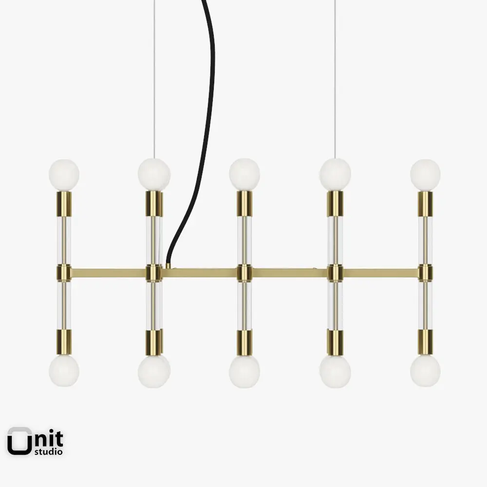 Acrylic Framework is a industrial chandelier with a rectangular shape. Available in brass or nickel has a double series of white glass bulb lights which face contemporaneously toward the ceiling and the floor. Distributed by West Elm.