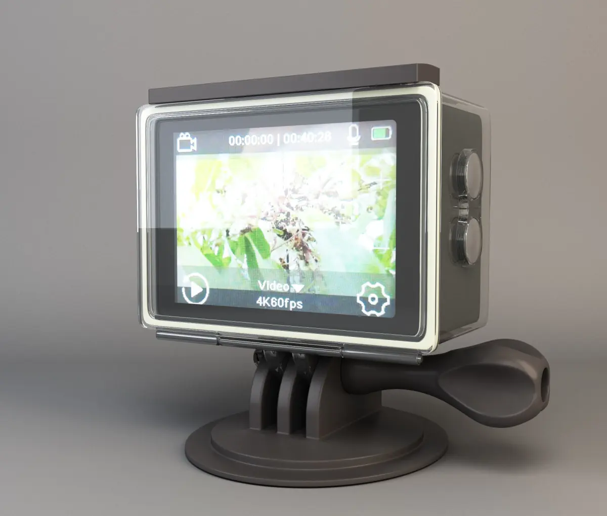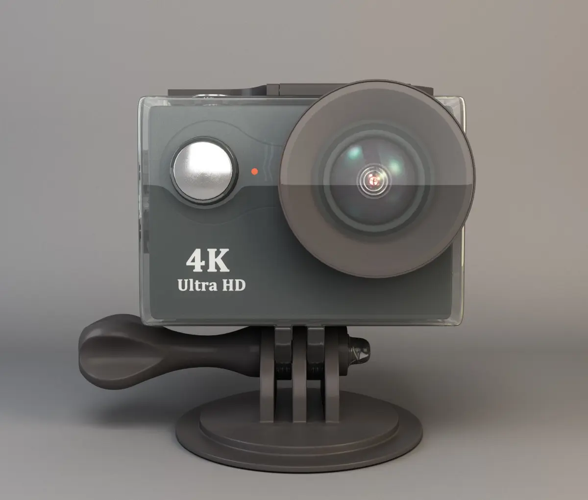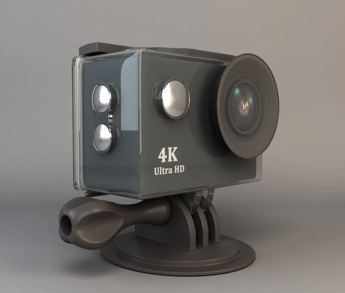 High quality static model of action camera. Photorealistic materials. Geometry of the protective box has been worked out in detail. All clamps, spring, pins are made. Separate unwrapping on protective box and camera.