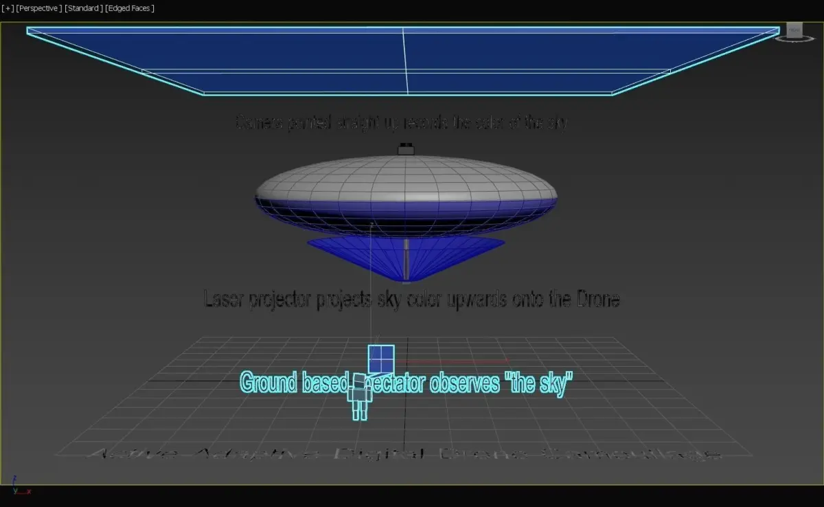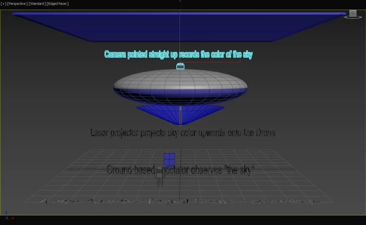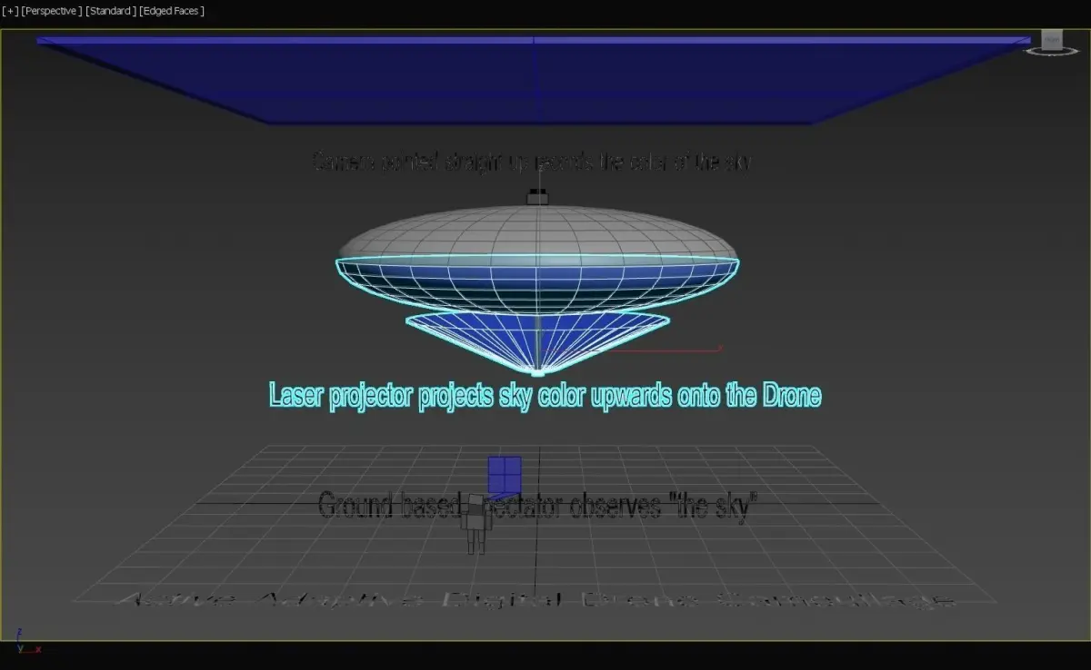 -1 a top mounted camera, records the color of the sky.-2 a bottom mounted [or lowered when needed when hoovering for observing while camouflaged] laser projector, projects the live sky onto the bottom of the drone.-3 a ground based observer, will only ever see the sky, as if the entire drone or object, optically appeared to be fully translucent.