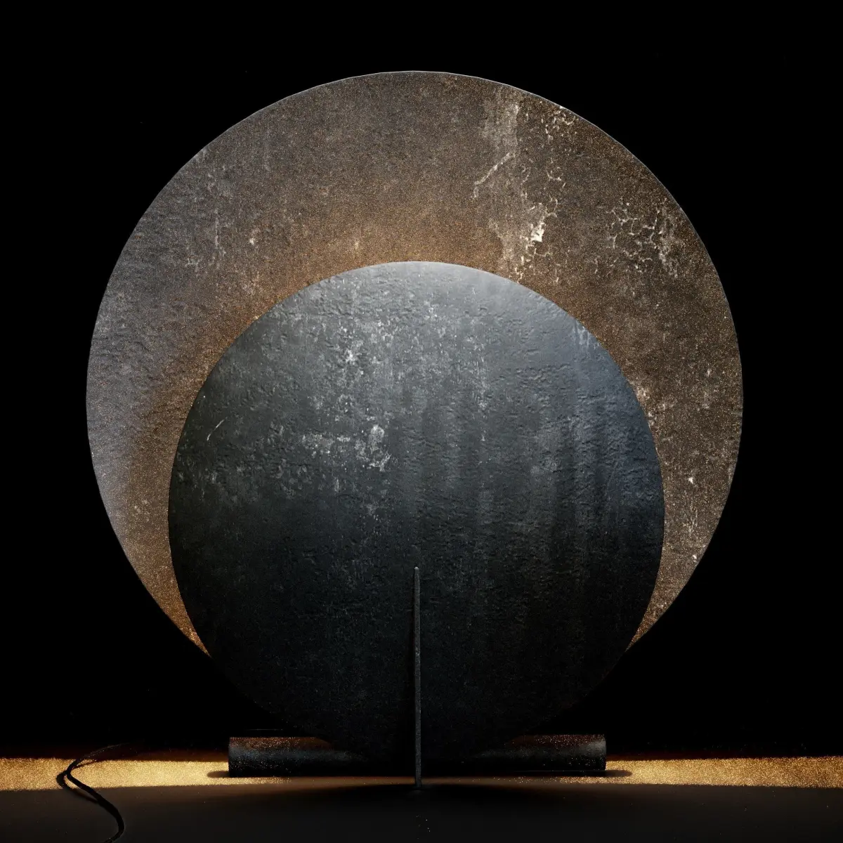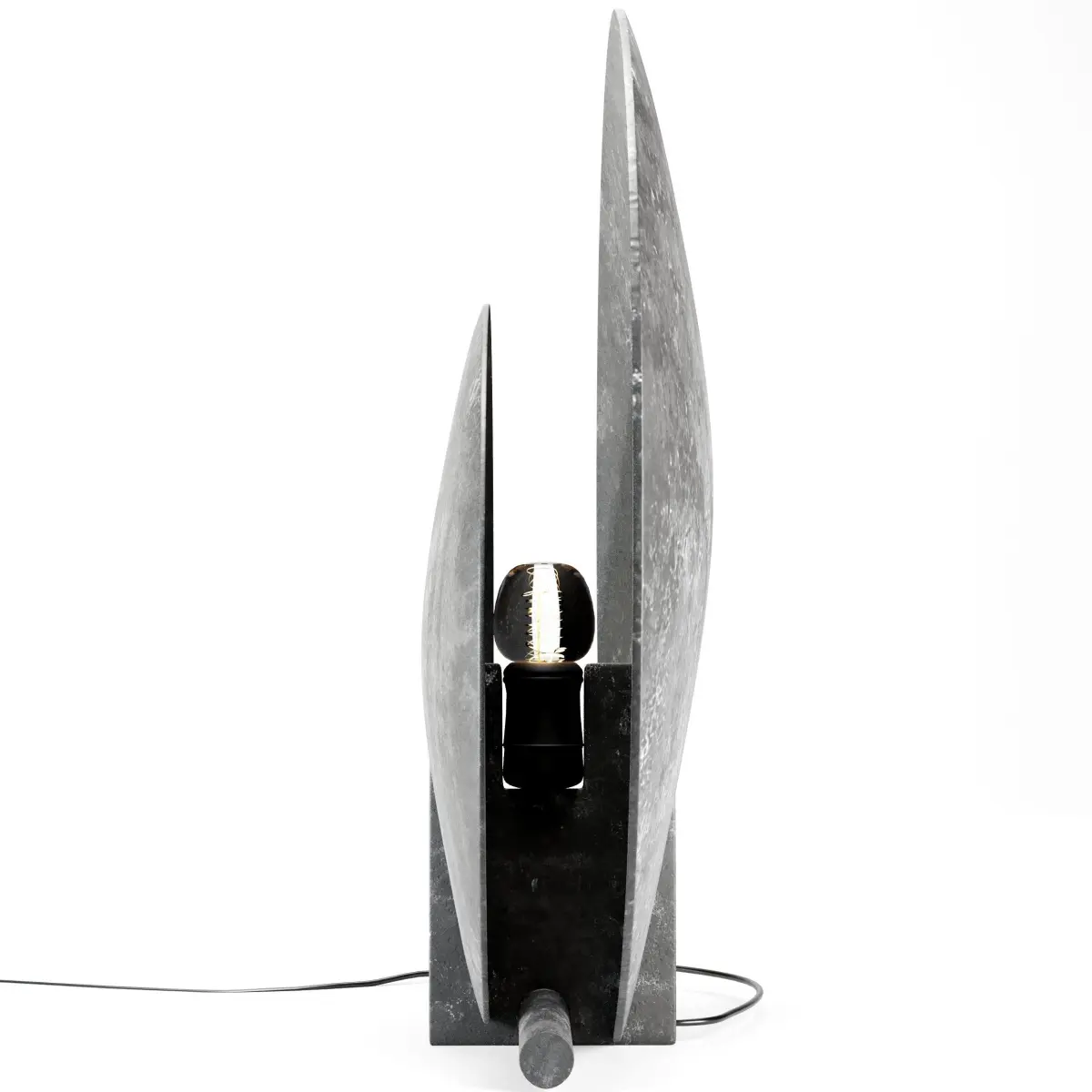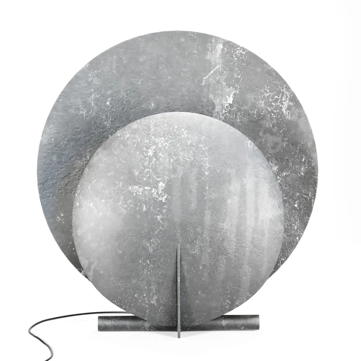 AD Floor LampThe round, geometric shape and sculptural construction of the AD Floor Lamp is influenced by the austere Brutalist movement of the mid-20th Century. The oxidized surface is textured and almost resembling concrete as a nod to the architectural source of inspiration. Thin aluminum plates comprising the plate geometry shape enclose the light source providing a smooth light scattering, the lamp is pleasant yet functional in every setting. It looks paper thin from some angles and solid from others playing with the subtle movement of light. (Taken from the product description)