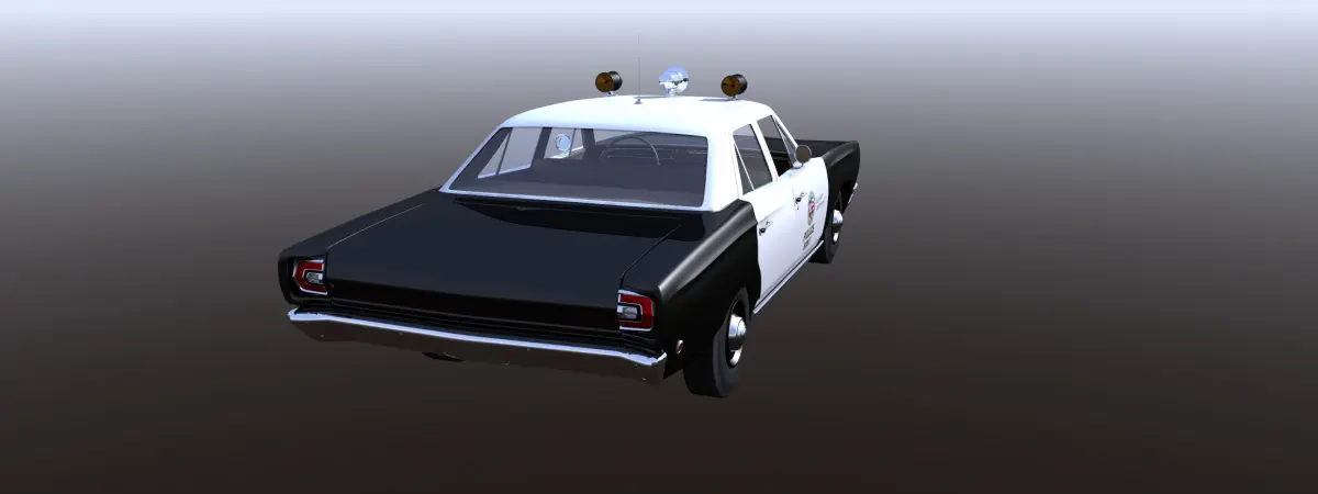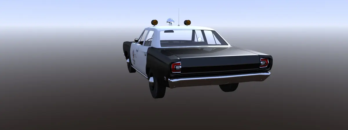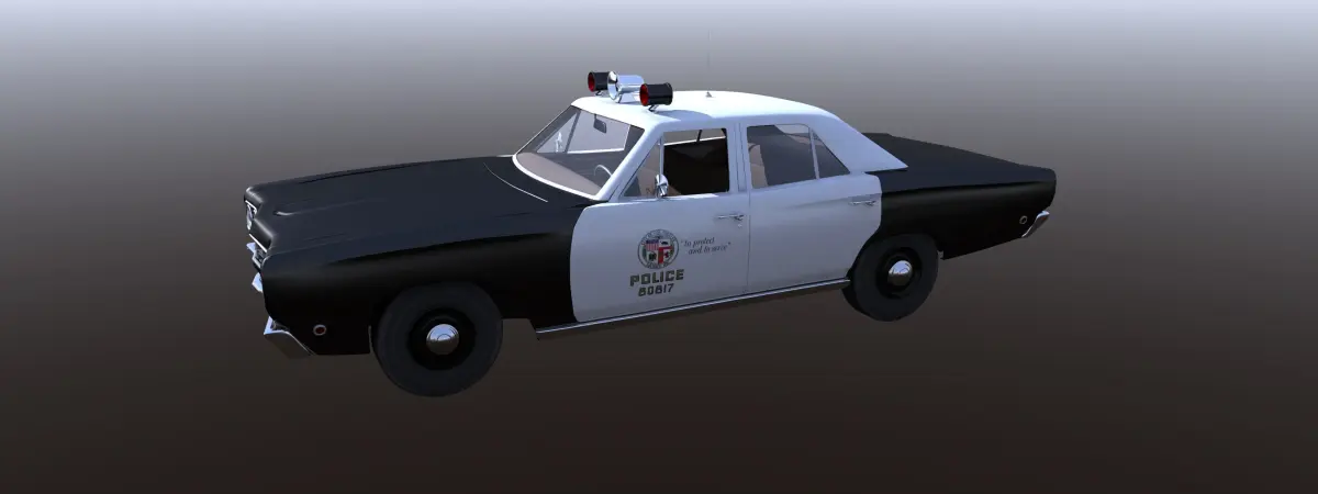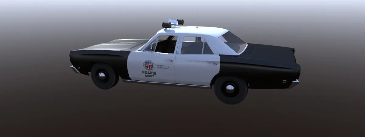 This is a model of a LAPD Police car that was used in the 1968-1975 TV show Adam-12. This object has no door, trunk or hood hinges. It is a polygon mesh that is rigged in lightwave with a steering null and proper pivots on the wheels, doors, trunk and hood. I do not know if the pivots and nulls work in any other program other than Lightwave. I am using the rough 401 engine that was stock in the 64 Buick Wildcat and like that car, I did not finish out the engine compartment. Please Enjoy. This model was not built for 3D printing.