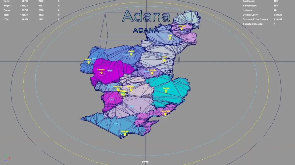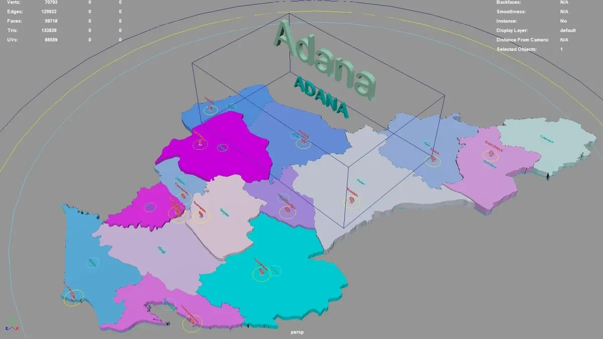 Adana regions : The model is divided according to the administrative region of Adana. Each region is clearly separated so you can easily isolate it or change the colors. Names are also editable and separate.
