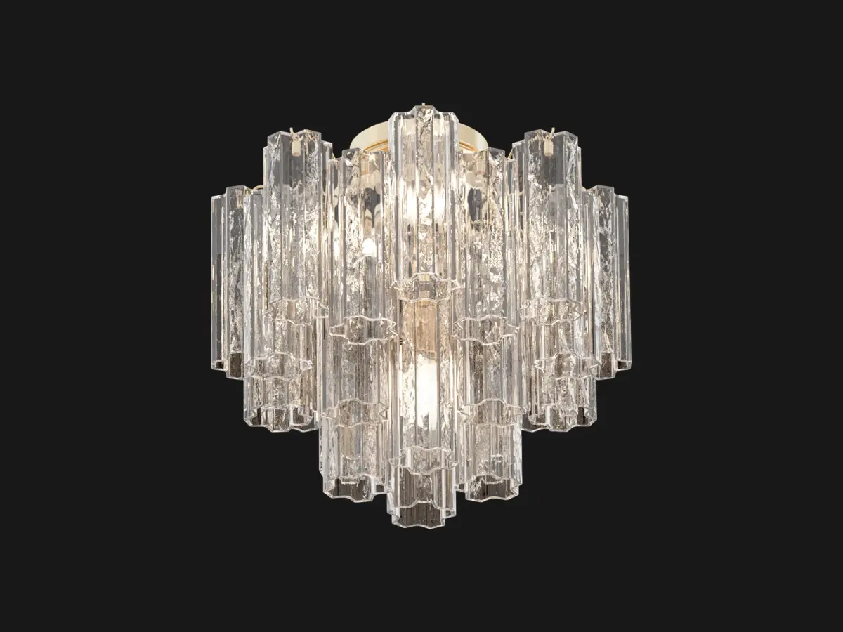 The captivating Addis Lighting Collection is a modern-day interpretation of the iconic mid-century Tronchi chandelier. Inspired by its predecessor's sleek lines and geometric shapes, the Addis features a polished Chrome or Aged Brass metal frame that exudes sophistication and style. Its unique design showcases transparent tiers of textured Tronchi glass tubes, forming a mesmerizing 5-point rounded star shape. Choose from a range of glass colors, including clear, amber, smoke, and white, or the stunning Autumn option, which features a captivating multicolor disposition of amber, clear, and smoke Tronchi glass. The Addis Lighting Collection offers various sizes and finishes, allowing you to find the perfect fit for your space while adding a touch of timeless elegance.