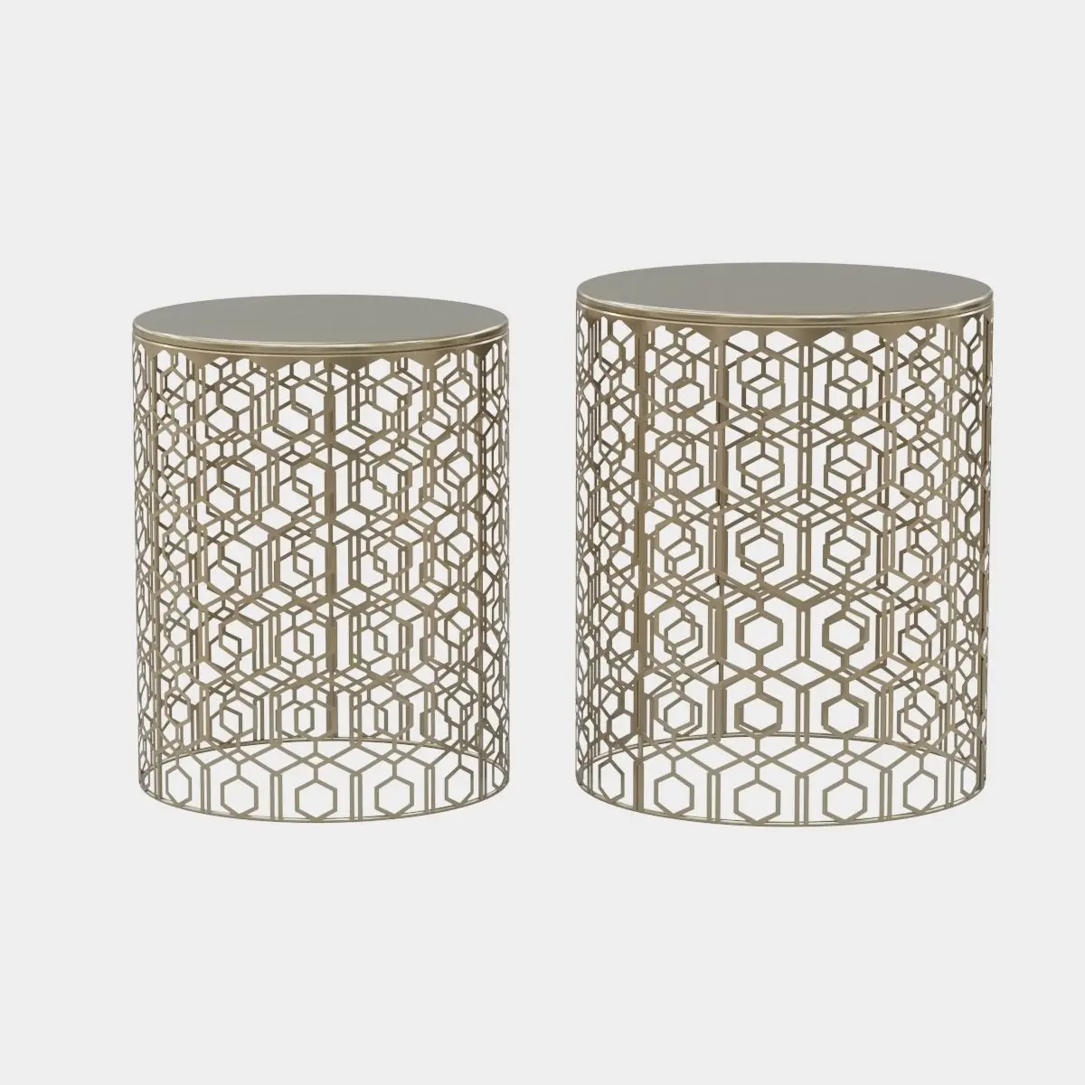 Dimensions: Large16.5(Dia) x 20.25(H); small: 15(dia) x 18.75(H); weight capacity: 180 lbs.Material: made of metalDesign: Decorative nesting round side end accent Coffee side table, Sleek style with a nesting design, metallic Gold finish brings a sense of elegance and erectly accents any color in the room.The table Advantage: lightweight and Sturdy design, exception durability, hexagon pattern, and easy to store in a corner or by the bed alternative Coffee table. 2 piece round nesting table can be provided with additional storage space. Use them on their own or together in a personal combination.For any occasion: Great for the living room, Bedroom, any room, store in a corner in the room wherever needs Also blend well with a variety of decor. Add to cart and easy to bring home.