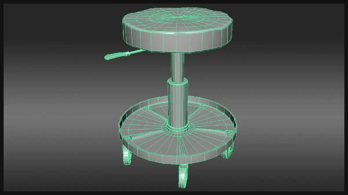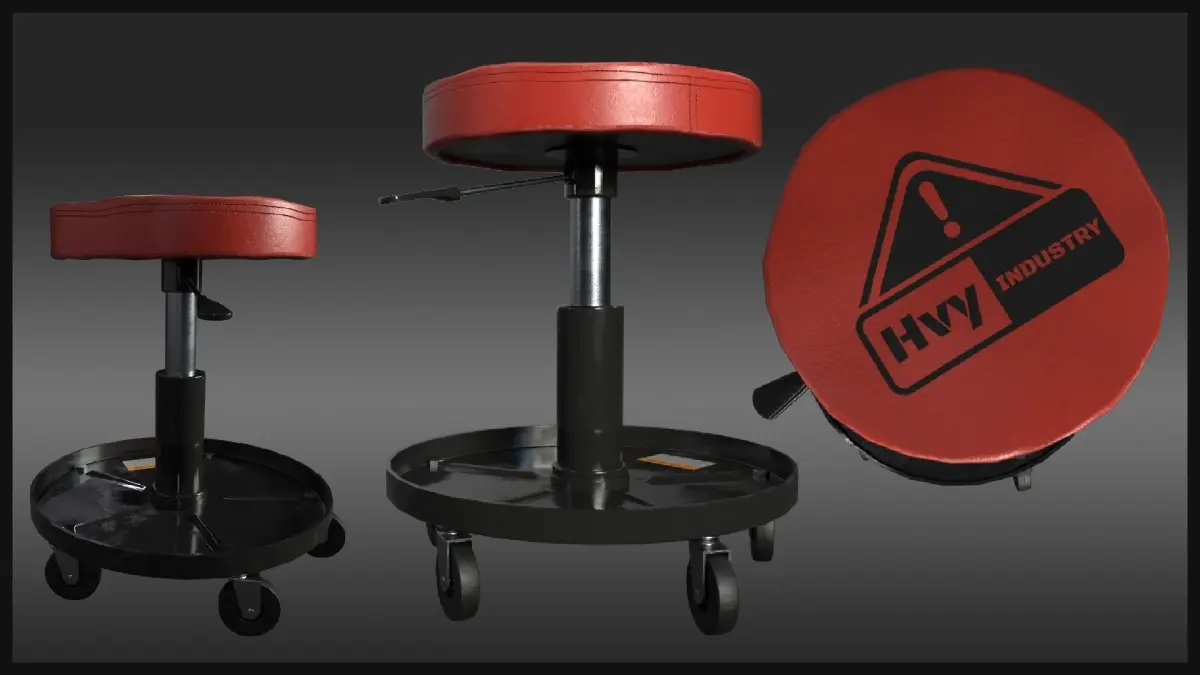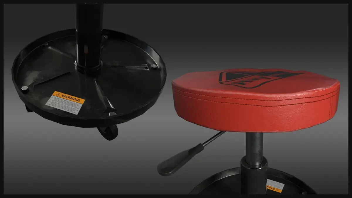 An adjustable shop stool that fits believably in any projects involving worn or used industrial machinery, workshops, or garages.