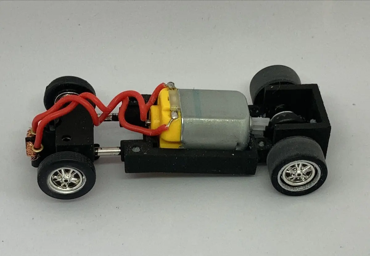 Can be used to convert 1/43 diecast to slot car, to improve performance of standard 1/43 or 1/32 commercial cars (like Carrera, SCX, Artin...) or in scratch build projects.Guide blade instead of pin for better corner handling and more drifting angle (you can use standard Scalextric or other brands).Adjustable front axle height with grub screws to allow fine tuning of the car rolling attitude in corners.Designed for proper slotcar tyres and rims on 2.38mm shaft (allows you to choose from a variety of standard slot car wheels* or use the ones I have for sale).Designed for the All Slot Car Crown Gear 22t (sold by Pendle Slot Racing under code AS005) and 9t pinion gear.Easy to remove parts: the chassis support is glued to the inside faces of the car body and the other part is attached with 2x12 screws. No force needed to install the motor: smooth installation. On diecast bodies, the paint on the inside where the glue is applied needs to be removed (sand paper will do the job. Epoxy glue works very well, like Araldite or Gorilla.Wheelbase adjustment: min 55mm, no max. Use 2.38mm (3/32”) rods, same diameter as the shafts.Width adjustment: min 26.5mm, max 41mm (more width can be achieved gluing a layer of balsa wood to the adjustable supports if necessary).