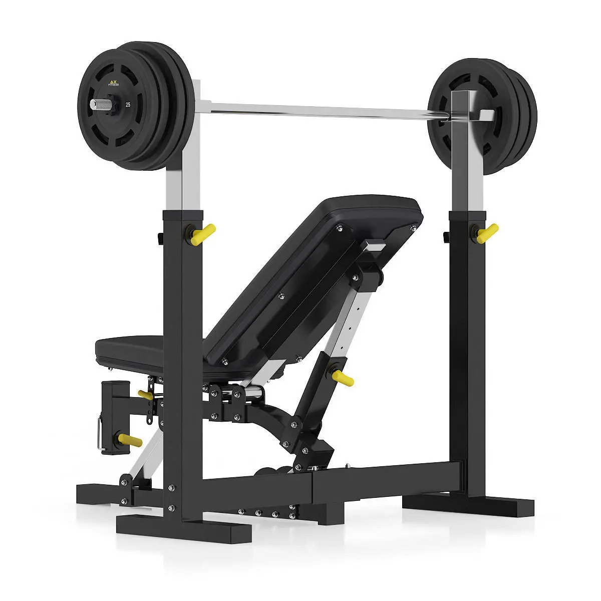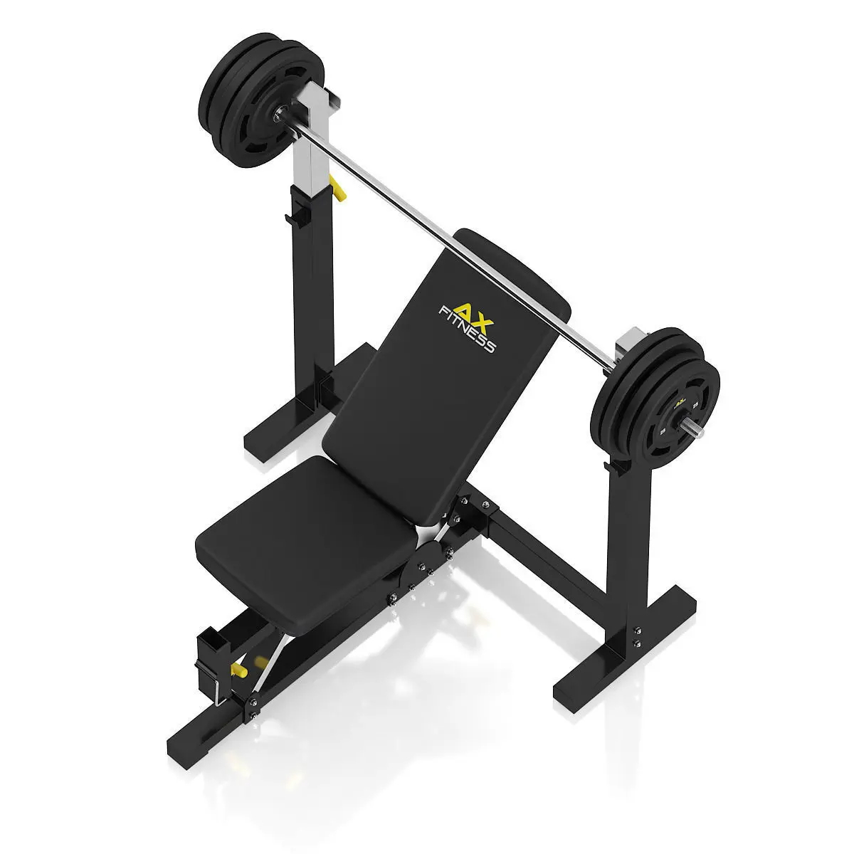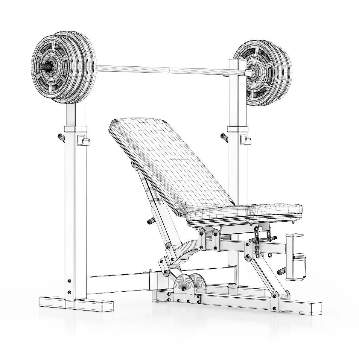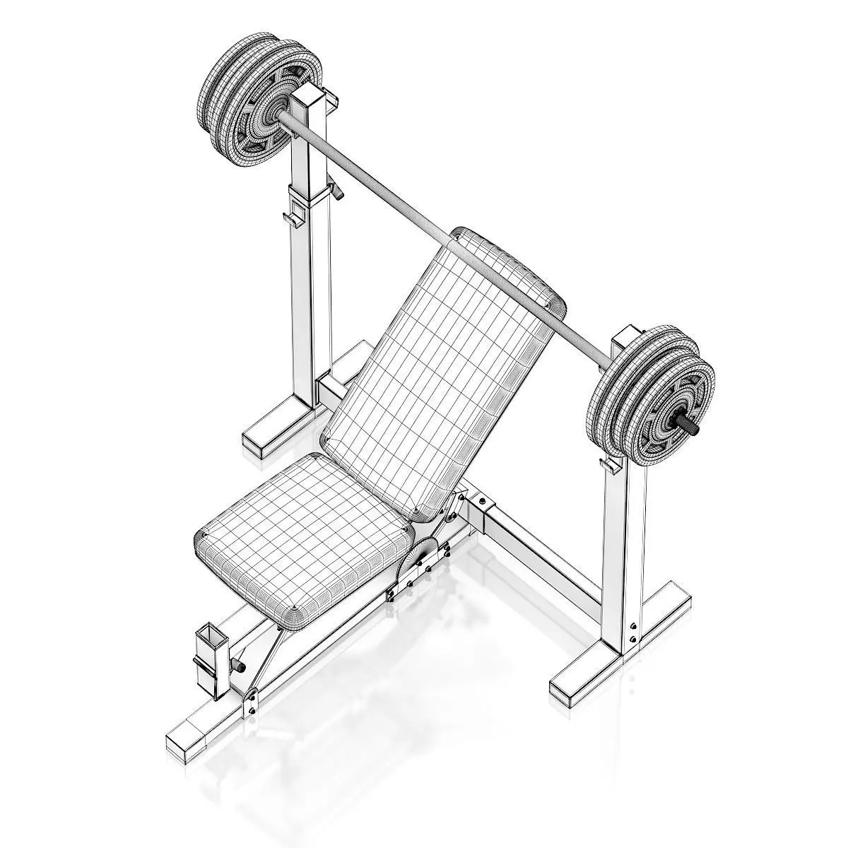 3d model of black adjustable weight bench with a barbell.