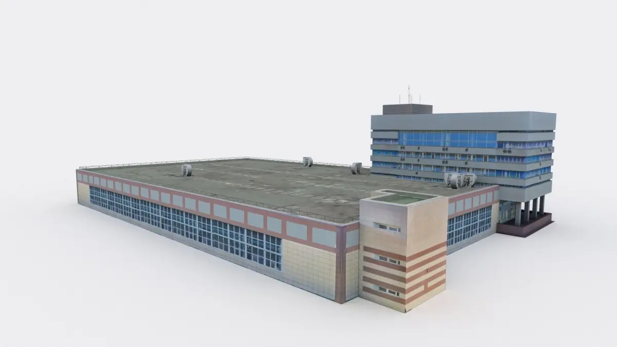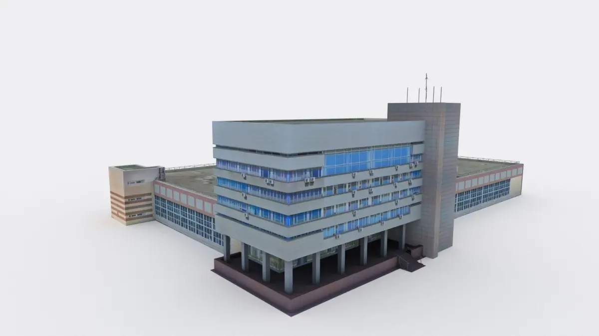 3d model of an administrative building with textures (4096x4096 and 2048x2048).Well suited for game dev and not very close distances. Not a very large number of polygons - only 738.