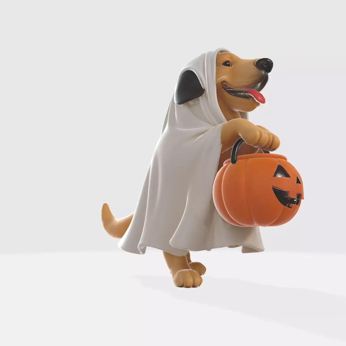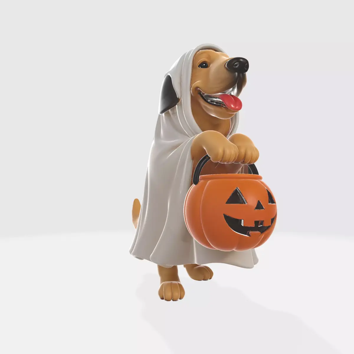 Get into the Halloween spirit with this adorable 3D printed dog dressed as a friendly ghost, carrying a classic pumpkin trick-or-treat bucket! Perfect for Halloween enthusiasts, pet lovers, and those who enjoy unique seasonal decorations, this charming model is designed to bring joy to your holiday décor. Display it on your mantel, desk, or shelf to add a playful spooky vibe, or give it as a gift to someone who loves dogs and Halloween.