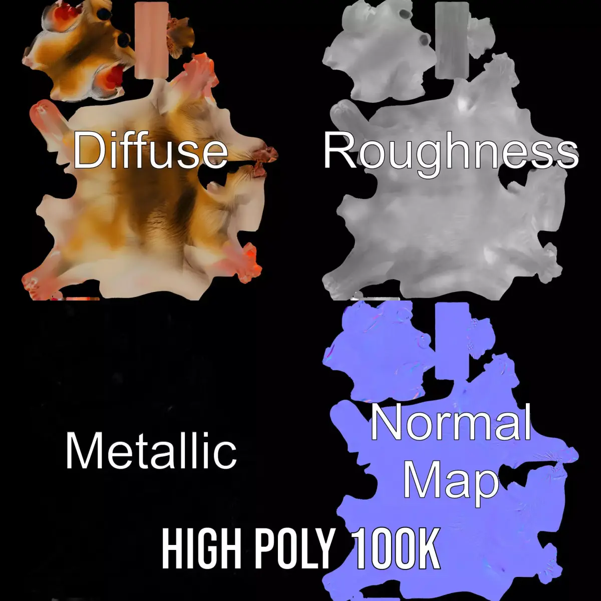 This Adorable Mouse Companion model pack offers a charming and realistic small rodent. Perfect for wildlife scenes, educational projects, and animation. Each model has 3 levels of detail: low-poly(1000 triangles for mobile), middle-poly(10,000 triangles for environment), and high-poly(100,000 triangles), allowing use in production rendering (such as 3ds Max, Maya, Cinema4D, Blender, Vray/Corona/Cycles), game engines (Unity and Unreal compatible), and interactive presentations, providing a choice of detail based on the LOD System principle. The model's textures are PBR, Diffuse, NormalMap, and reflection/roughness/metallic, suitable for any modern rendering engine. All models accurately unwrapped with no overlapping UV. All textures are 4096*4096 in size. Please like and leave a comment if you enjoy this model!