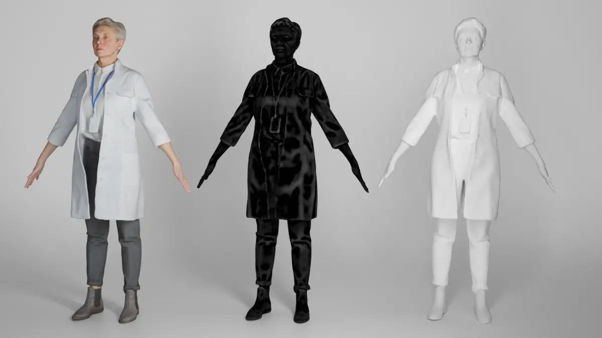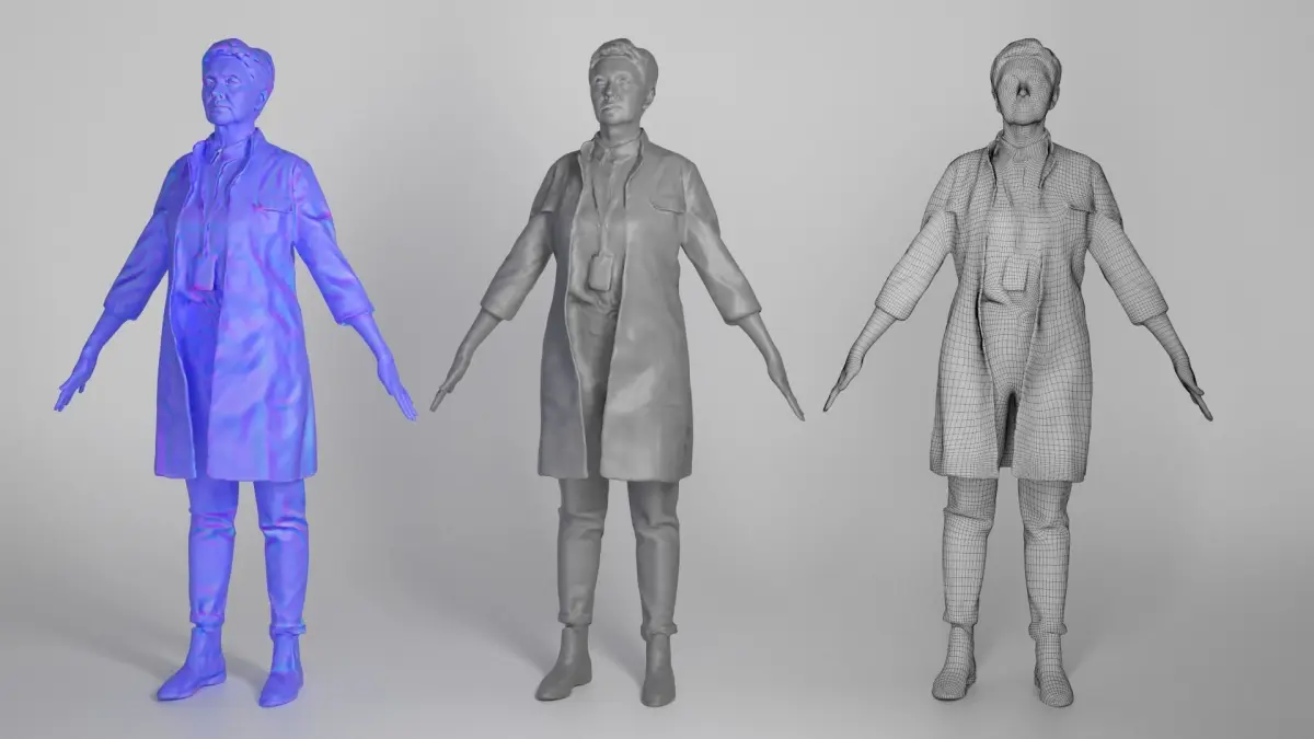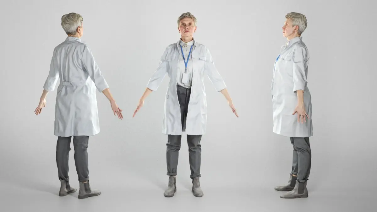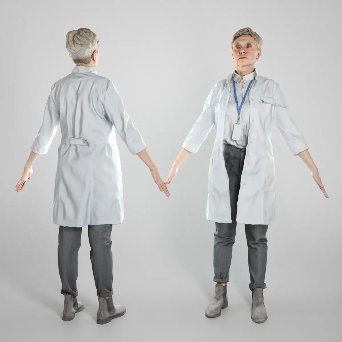 This is a true human size and detailed model of a beautiful adult woman of Caucasian appearance dressed in a uniform of a medical doctor. The model is captured in the A-pose with mesh ready for rigging and animation in all most usable 3d software. The product is ready for immediate use in architectural visualisations, inside Game Engines or for further render and detailed sculpting in Zbrush.