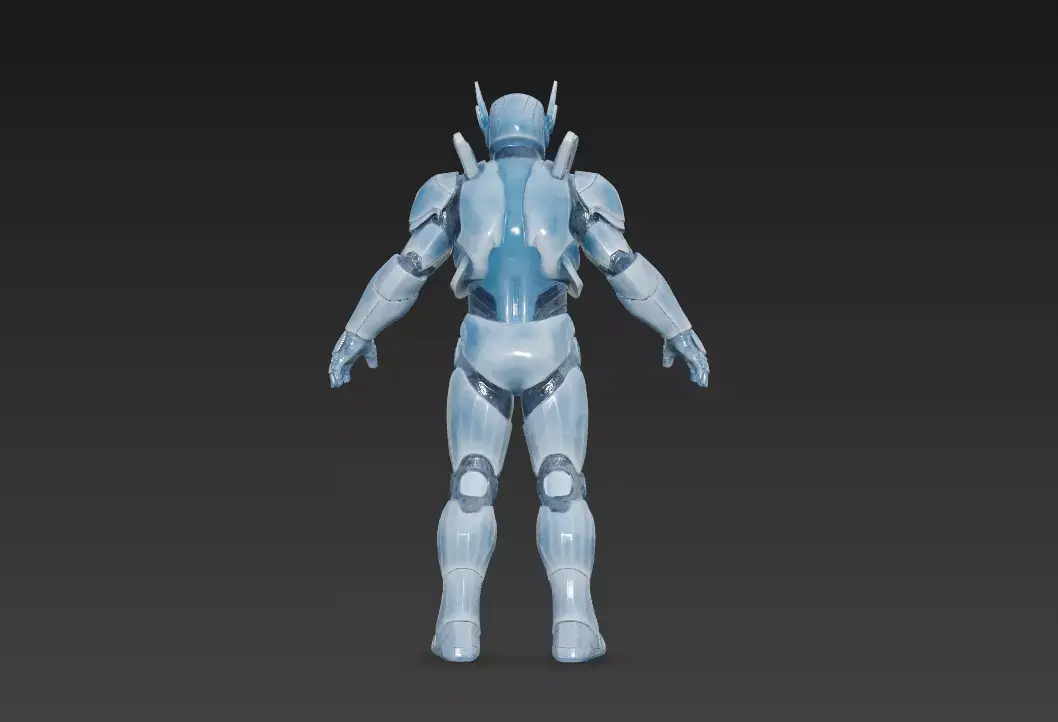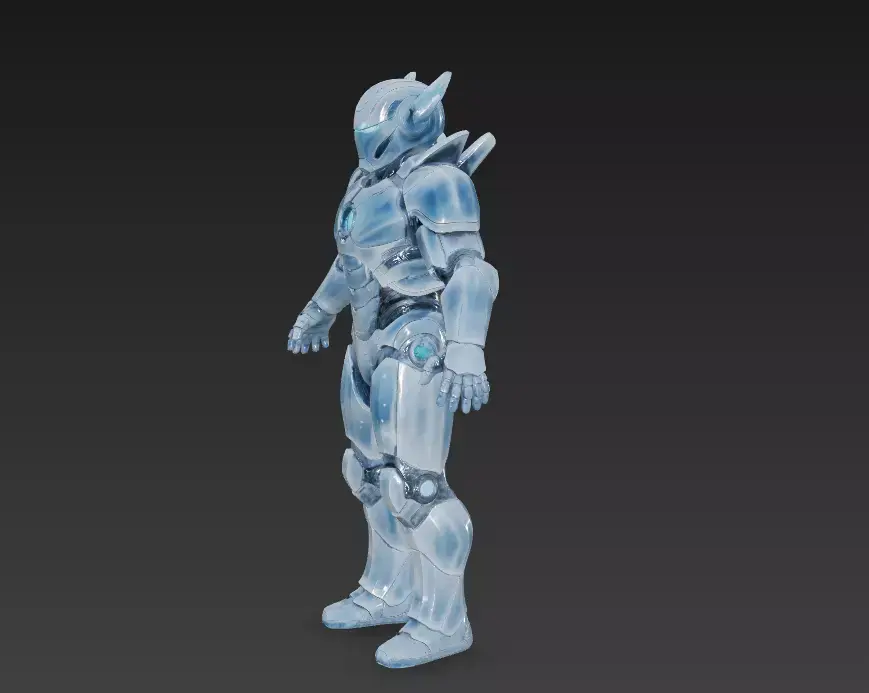 This high-quality futuristic blue power armor 3D character features a sleek exoskeleton design with smooth metallic plating, illuminated chest energy core, and reinforced mechanical joints. The model is suitable for games, cinematic renders, sci-fi films, VR/AR experiences, concept art, and visualization projects.