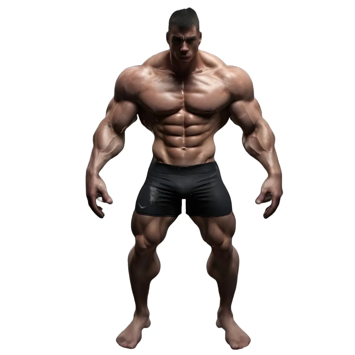 - Two muscular male figures with different builds (one bulkier with a beard, one lean and athletic)