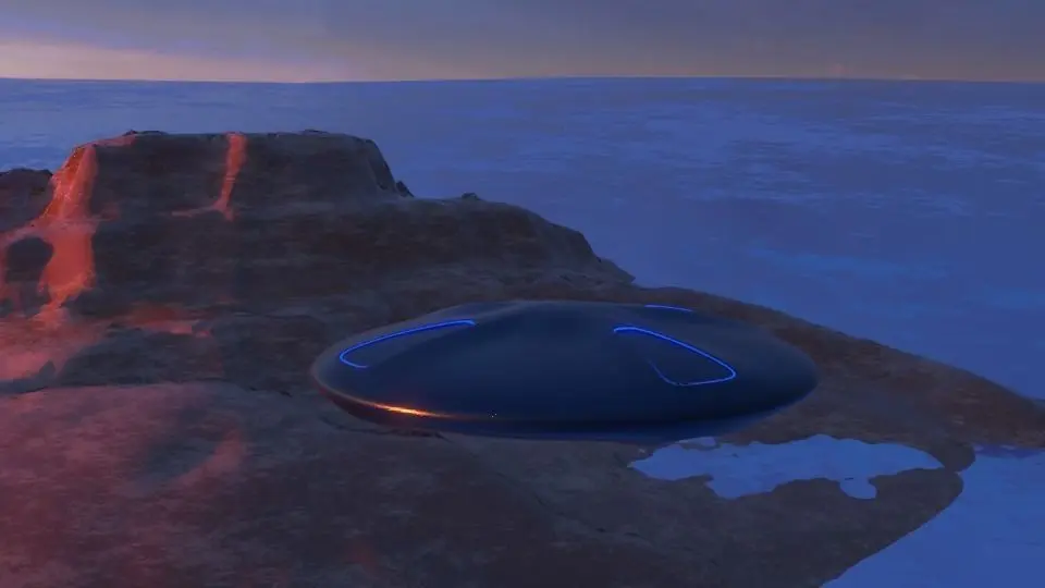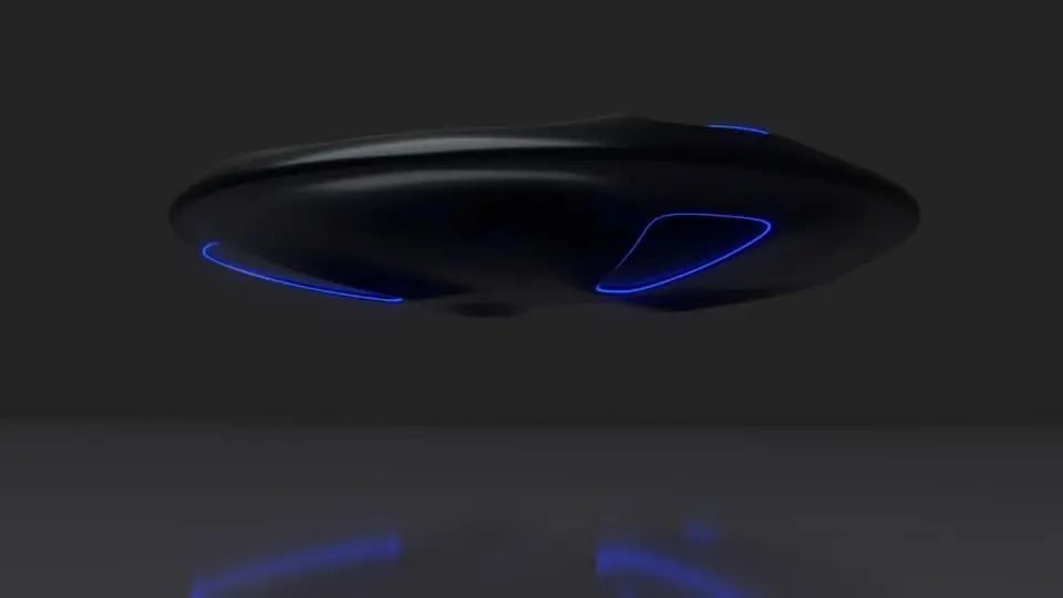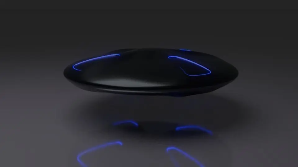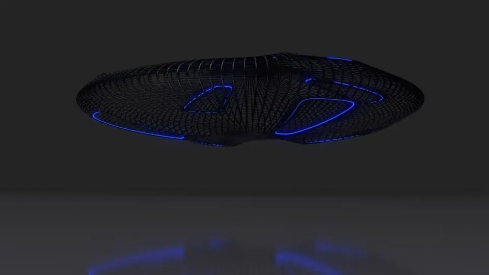 This is an advanced stealth UFO with 8 blue lights around 8 indented areas of the saucer (4 on top, 4 on the bottom). It has a smooth black