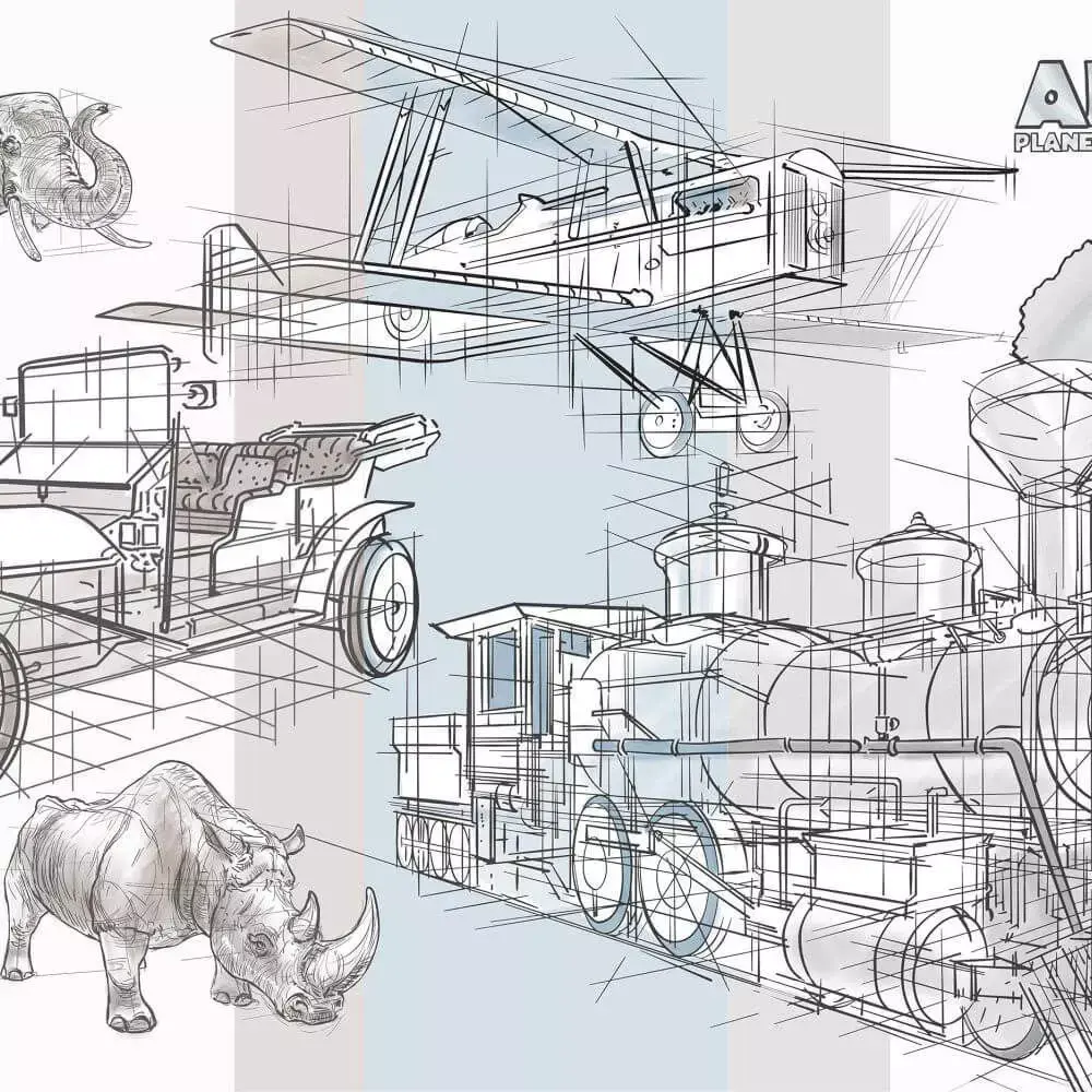 What’s includedHand‑drawn technical sketch collage of a biplane, early motorcar, and steam locomotive over soft panel bands in taupe, sky, and grey, delivered as a seamless high‑resolution mural texture.