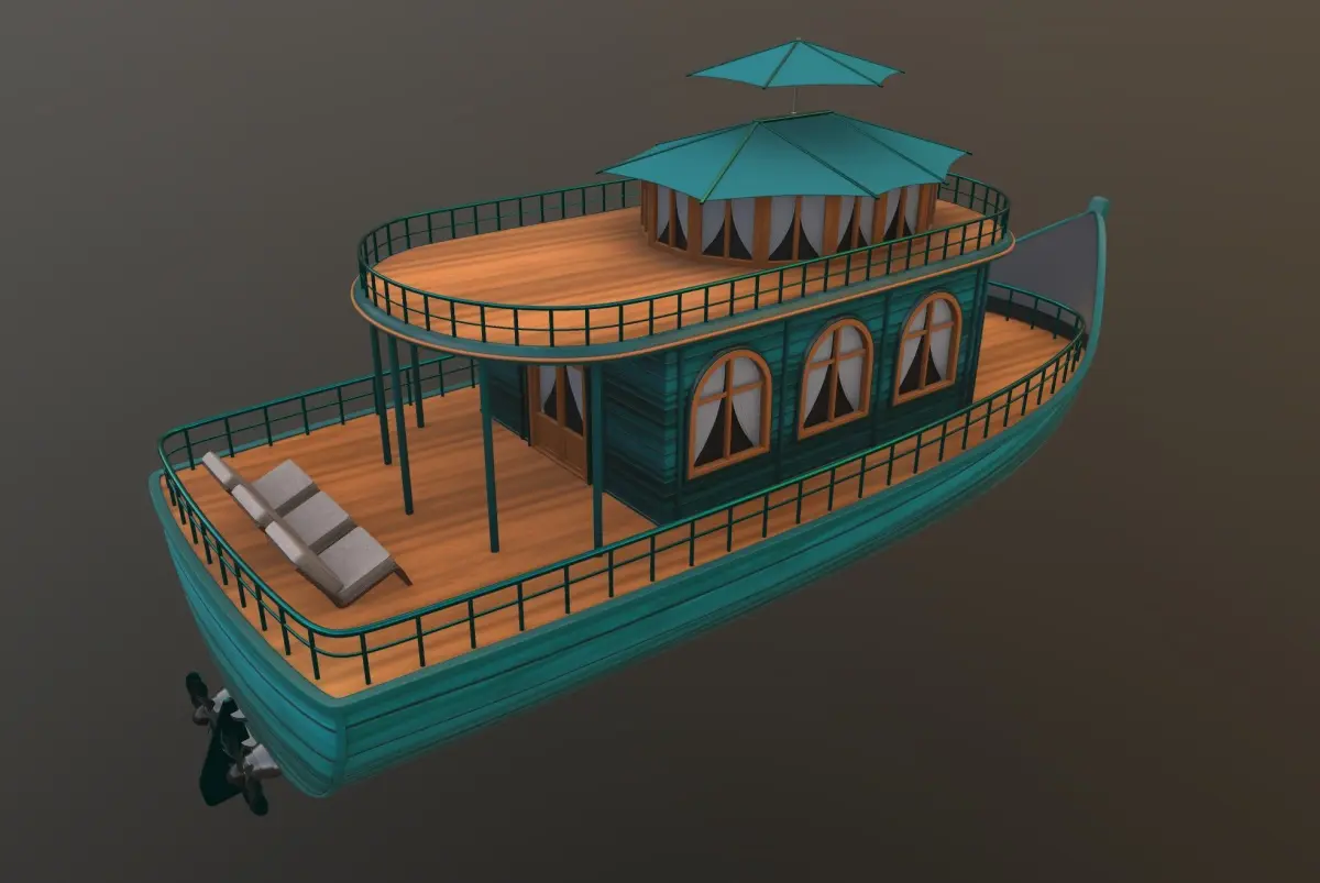 A unique adventure houseboat from the historical timeline, designed as a mobile houseboat with a sleek and modern shape, featuring a vibrant turquoise color that glistens under the sun, with a smooth texture resembling polished wood, perfect for exploring the waters in style.
