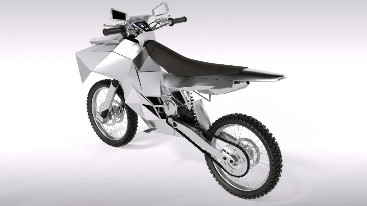 A stylish off-road motorcycle in a metallic silver hue, ideal for civilian riders in the current timeline. This bike showcases a unique angular design, LED headlights for enhanced visibility, and a digital display panel for easy monitoring of speed and fuel levels.