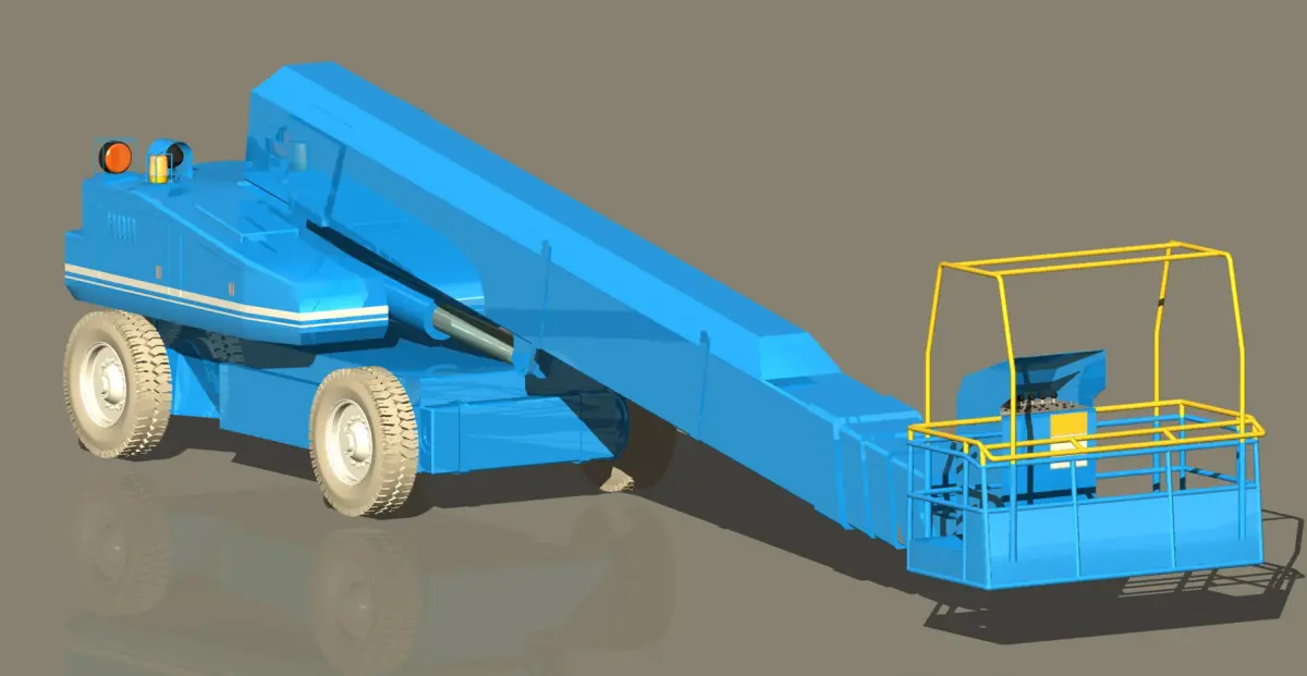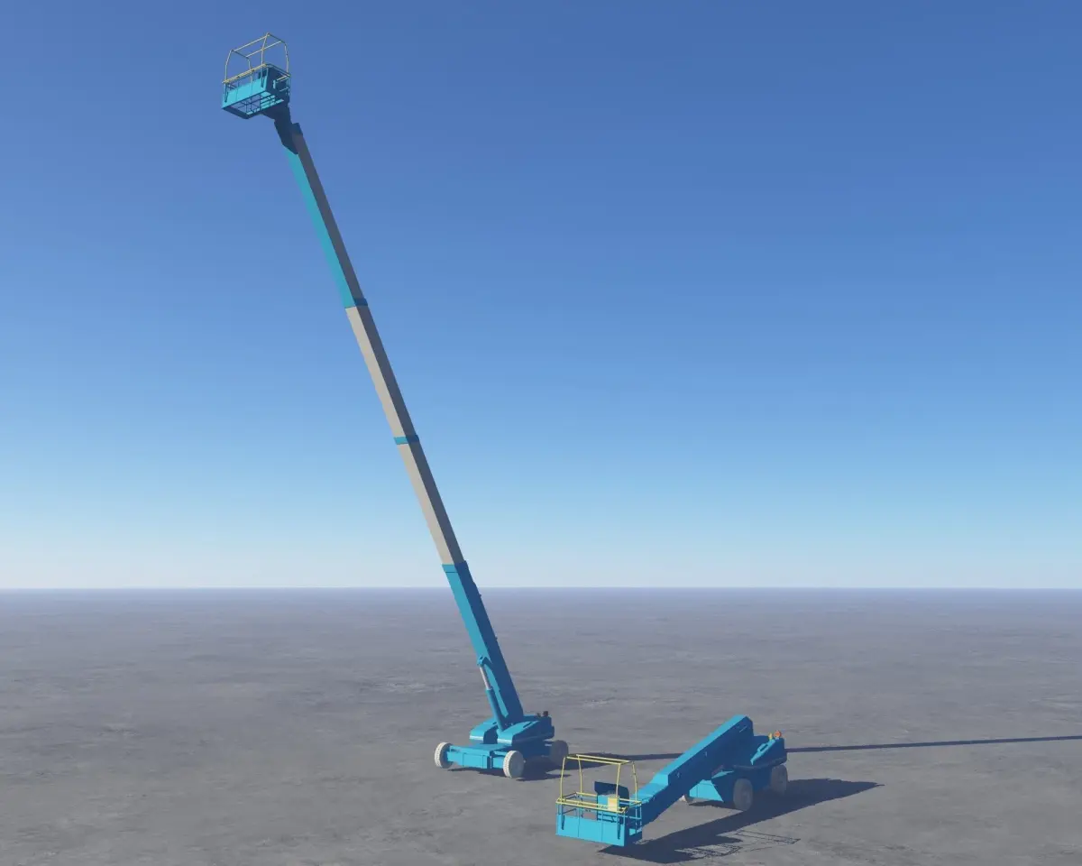 先端のバケットの搭乗して操作する型の高所作業車です。主に造船所の様な特殊な場所や室内、建設等で使用されます、今回は畳んだ状態とブームを伸ばし車輪を拡張した状態の2種類を各別ファイルを収録してあります。