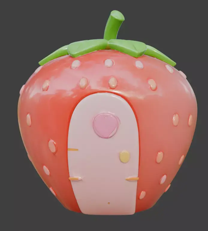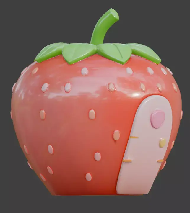 This premium 3D asset features a charming strawberry-themed cottage designed with a whimsical fairy-tale cartoon aesthetic.