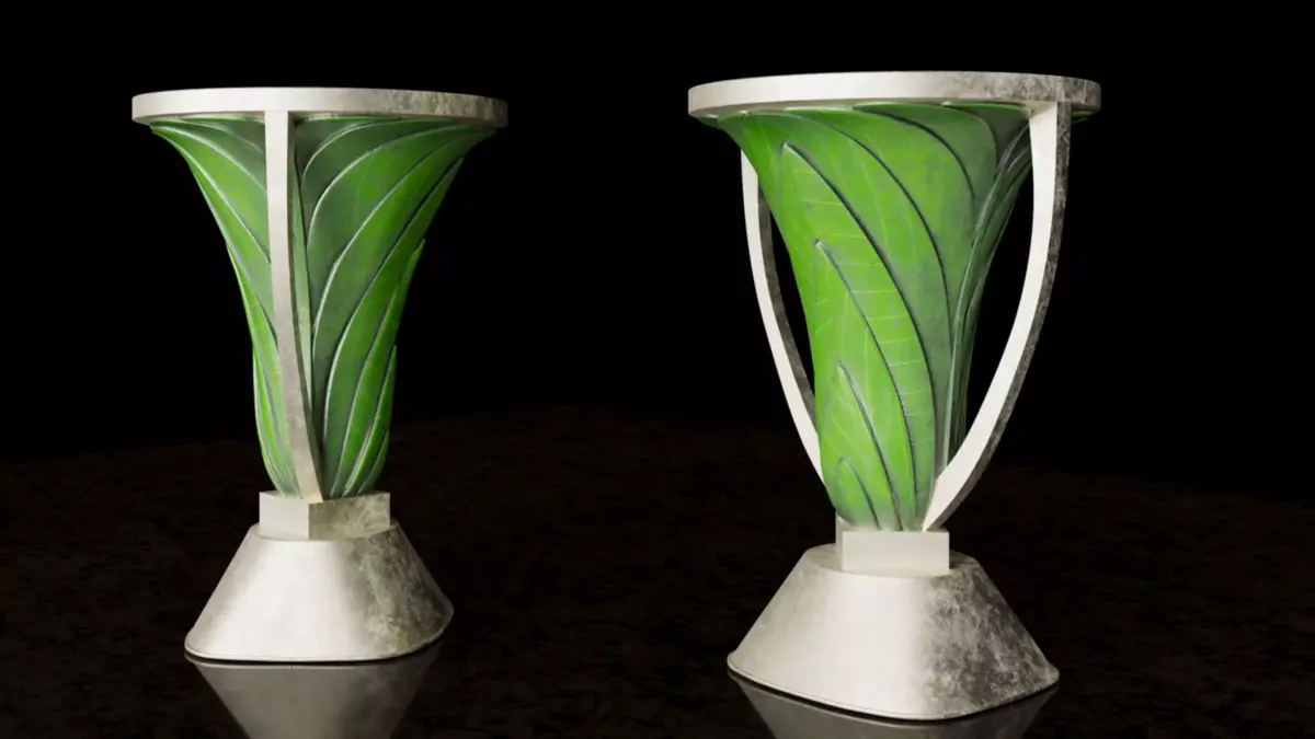 The piece combines elegance and symbolism, merging the dynamic energy of the sport with elements of nature — expressed through the flowing leaf-like patterns that rise gracefully around the core.