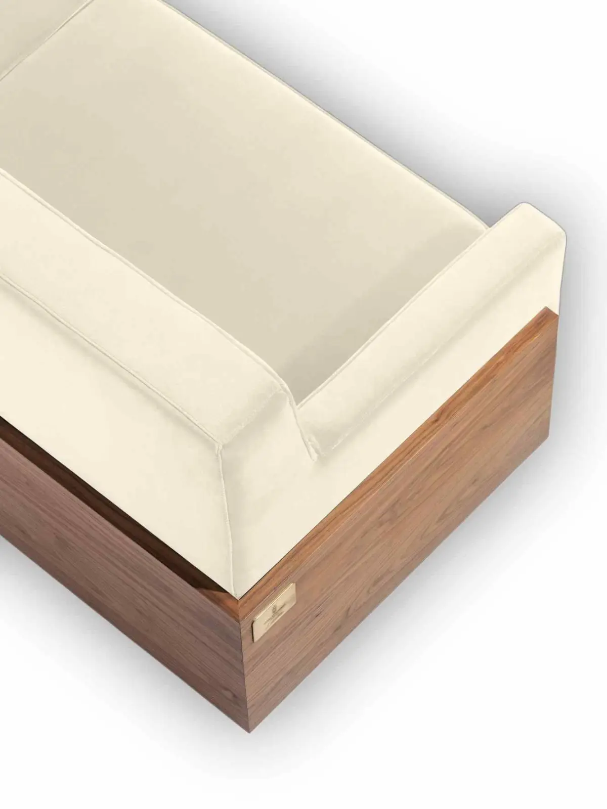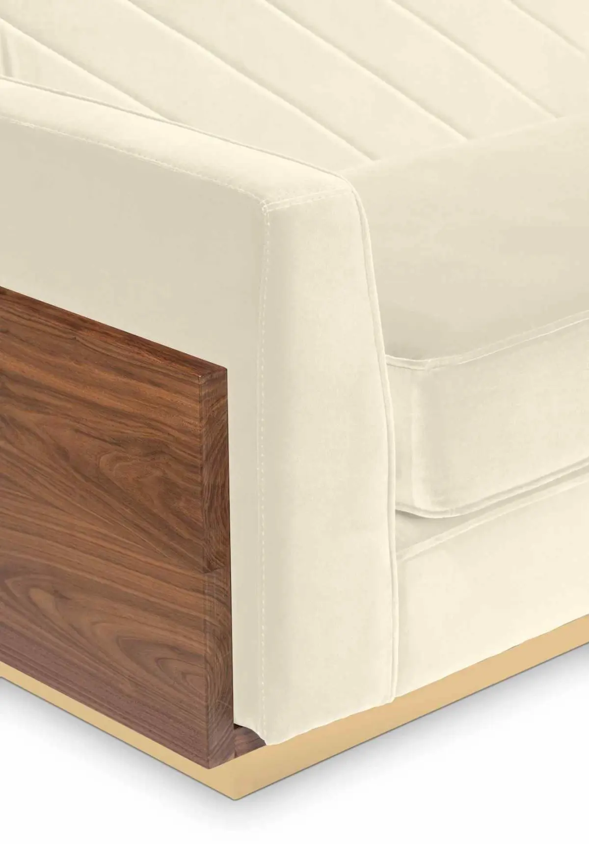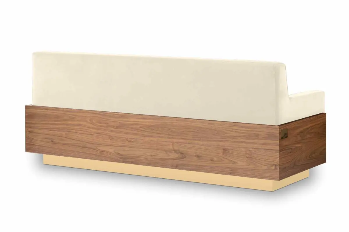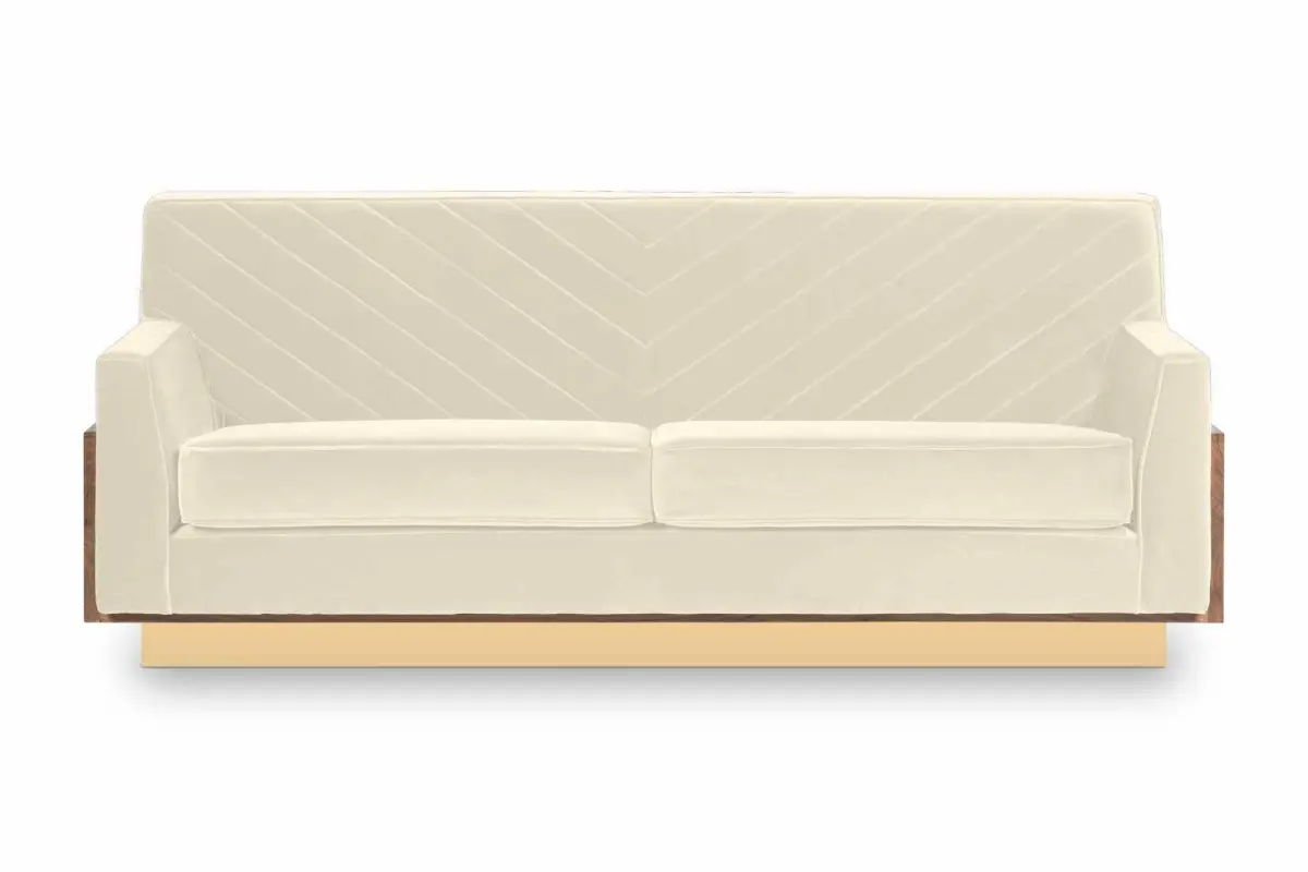Afonso Sofa is born from a wood veneer structure, royal velvet 100% cotton upholstery, and elevated from the floor by a goldenand noble element.