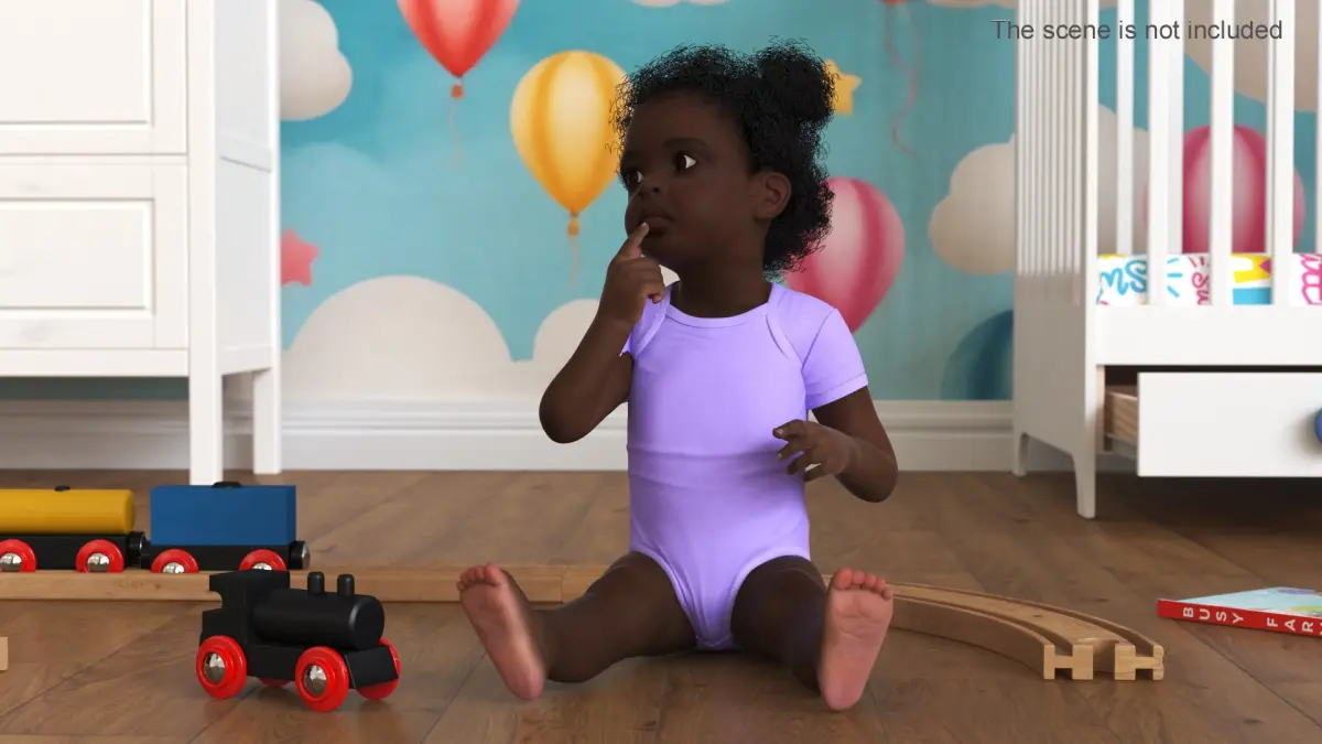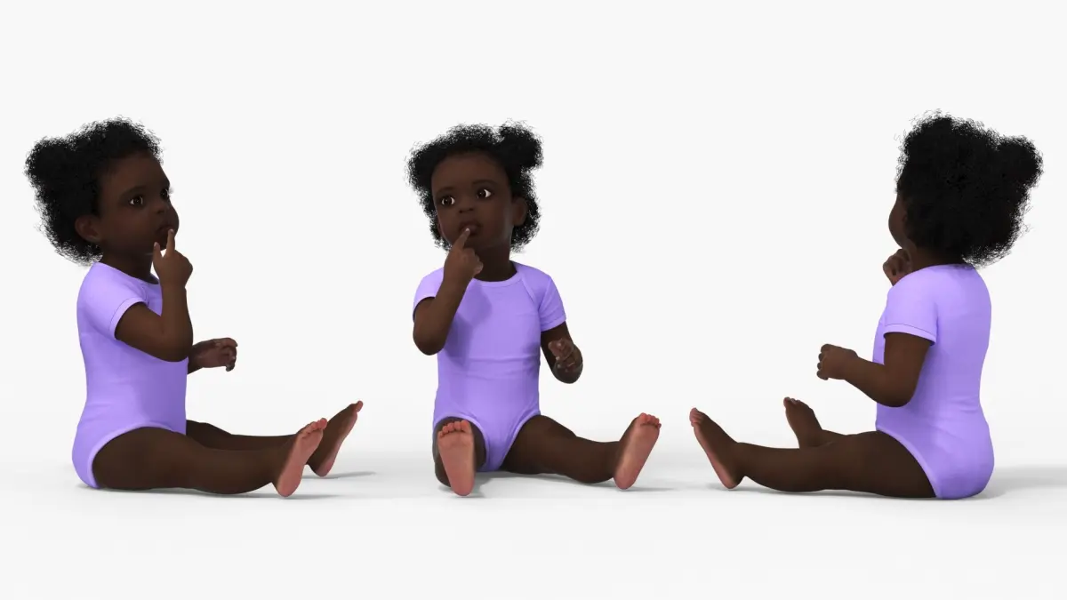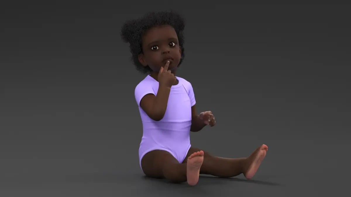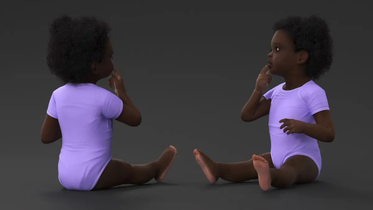 African Baby Girl Wearing Bodysuit Sitting is a high quality, photo real 3d model that will enhance detail and realism to any of your rendering projects. The model has a fully textured, detailed design that allows for close-up renders, and was originally modeled in 3ds Max 2020 and rendered with V-Ray. Renders have no postprocessing!