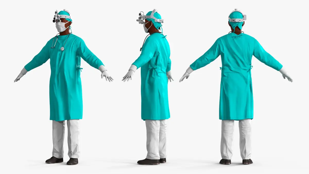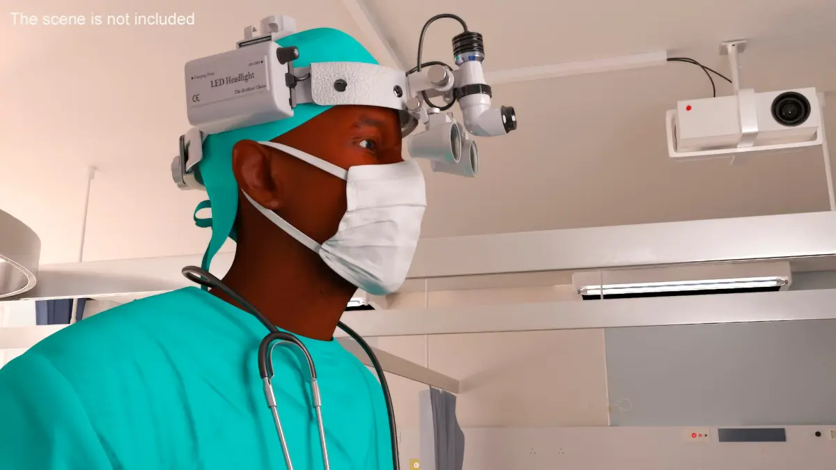 This model features a highly detailed representation of an African Black male doctor, complete with realistic facial features, medical attire, and a surgical headlight loupe rigged for animation. The headlight is adjustable, allowing for various positions to simulate real-life use in surgical or clinical settings. The model is designed for compatibility with various 3D animation software, making it ideal for showcasing medical scenarios in animations, simulations, or educational materials.