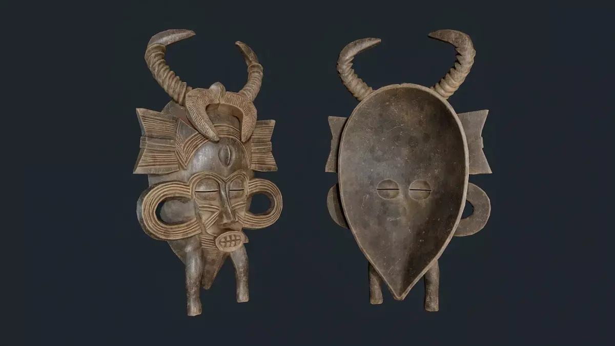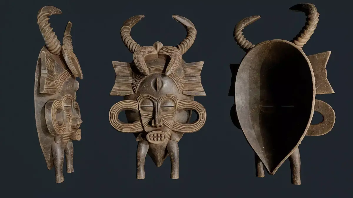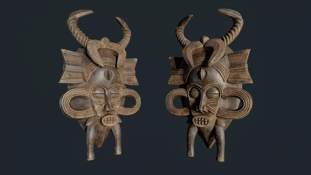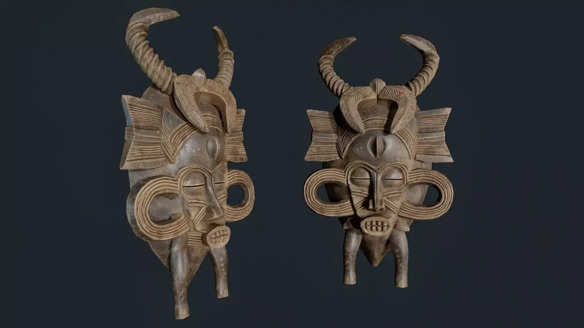The mask imitates hand-carved wood and natural pigments, reflecting the rich culture and traditions of African art. It is perfect for use as African decor in interiors, visualizations, design projects, and games.