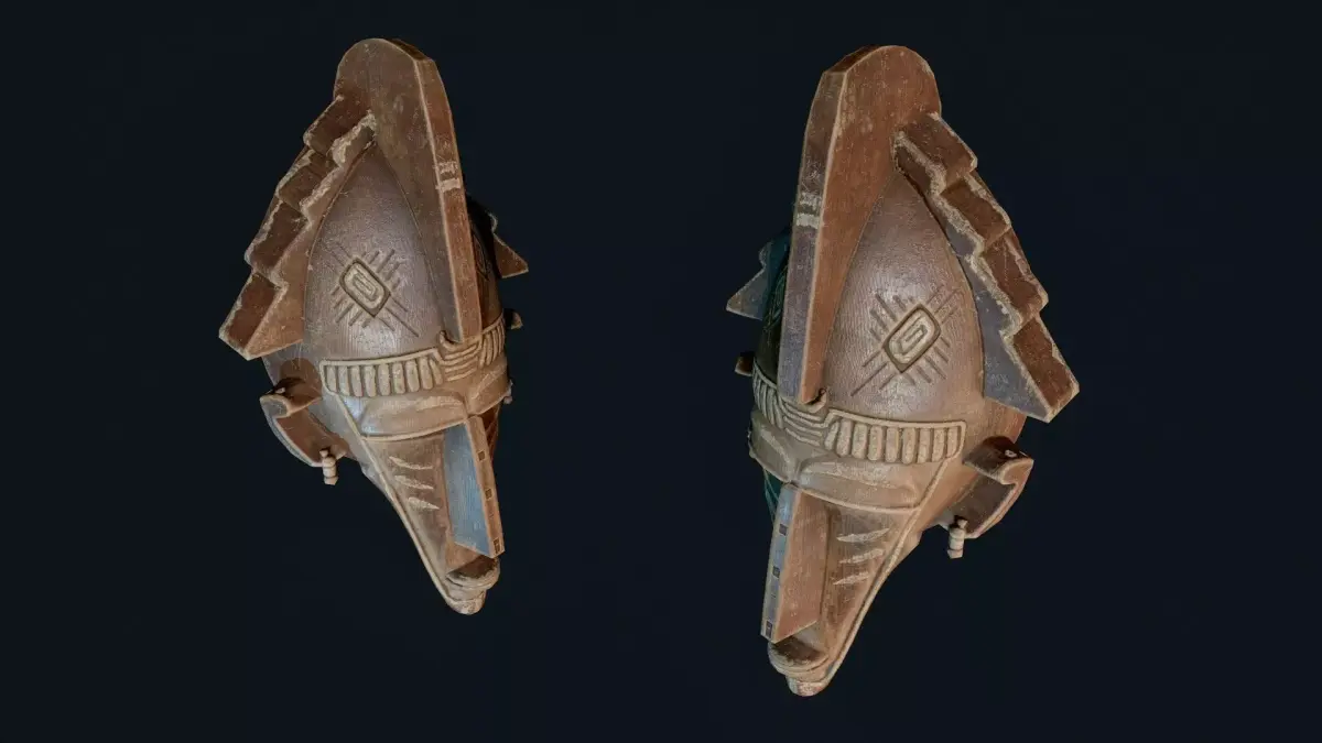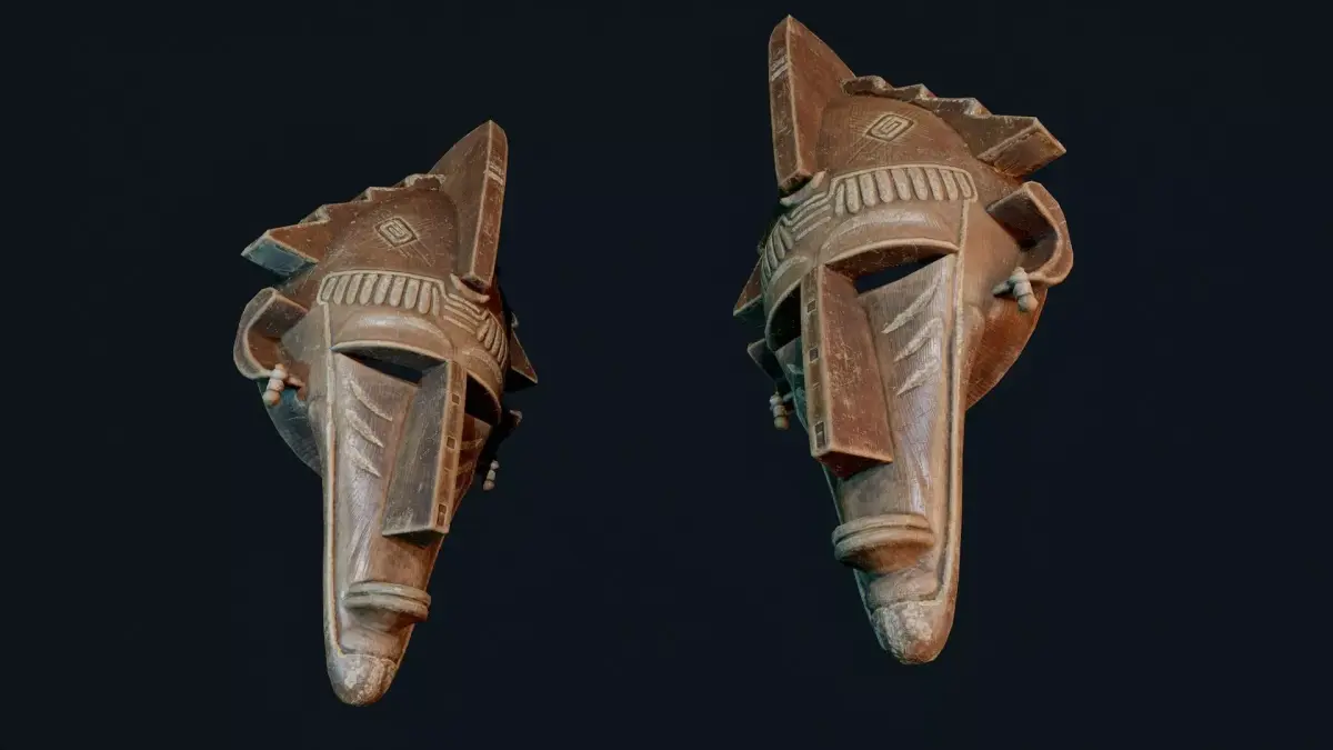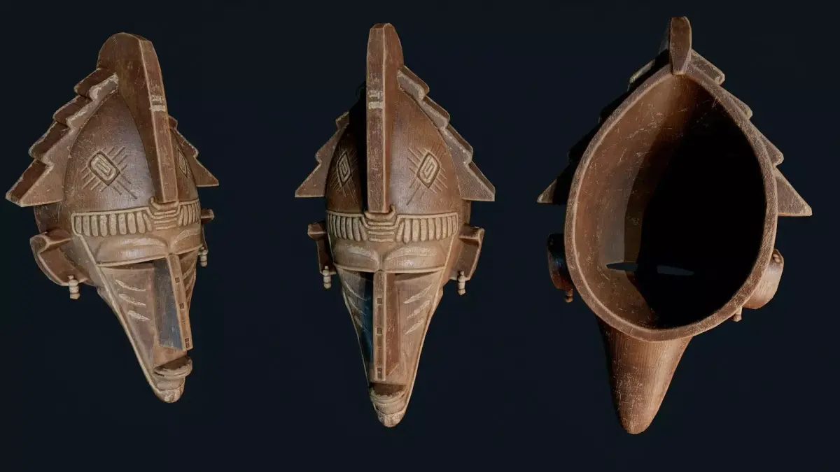 The mask imitates hand-carved wood and natural pigments, reflecting the rich culture and traditions of African art. It is perfect for use as African decor in interiors, visualizations, design projects, and games.
